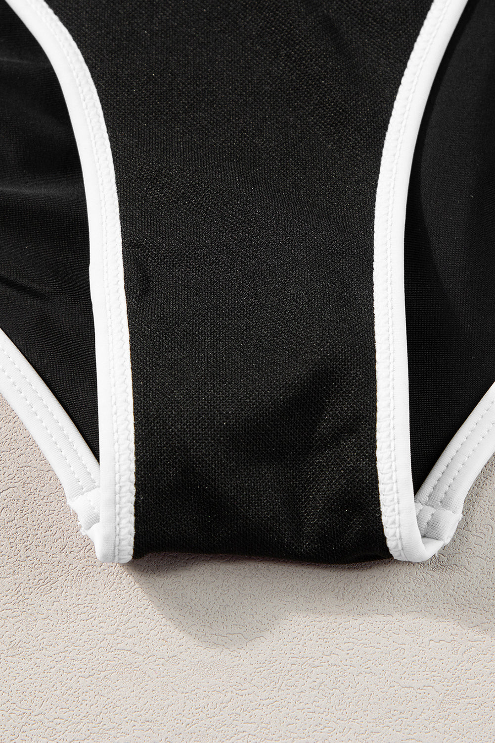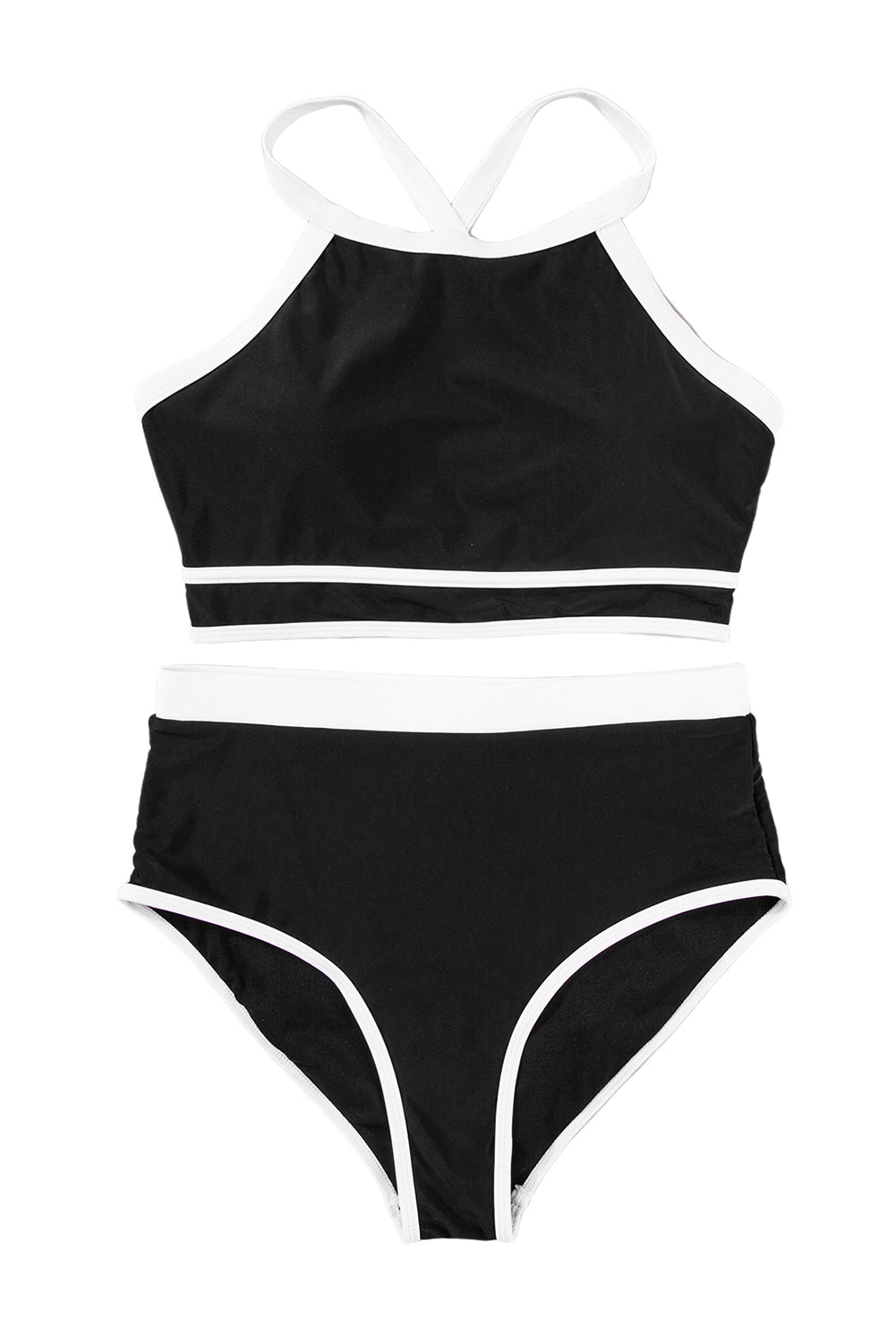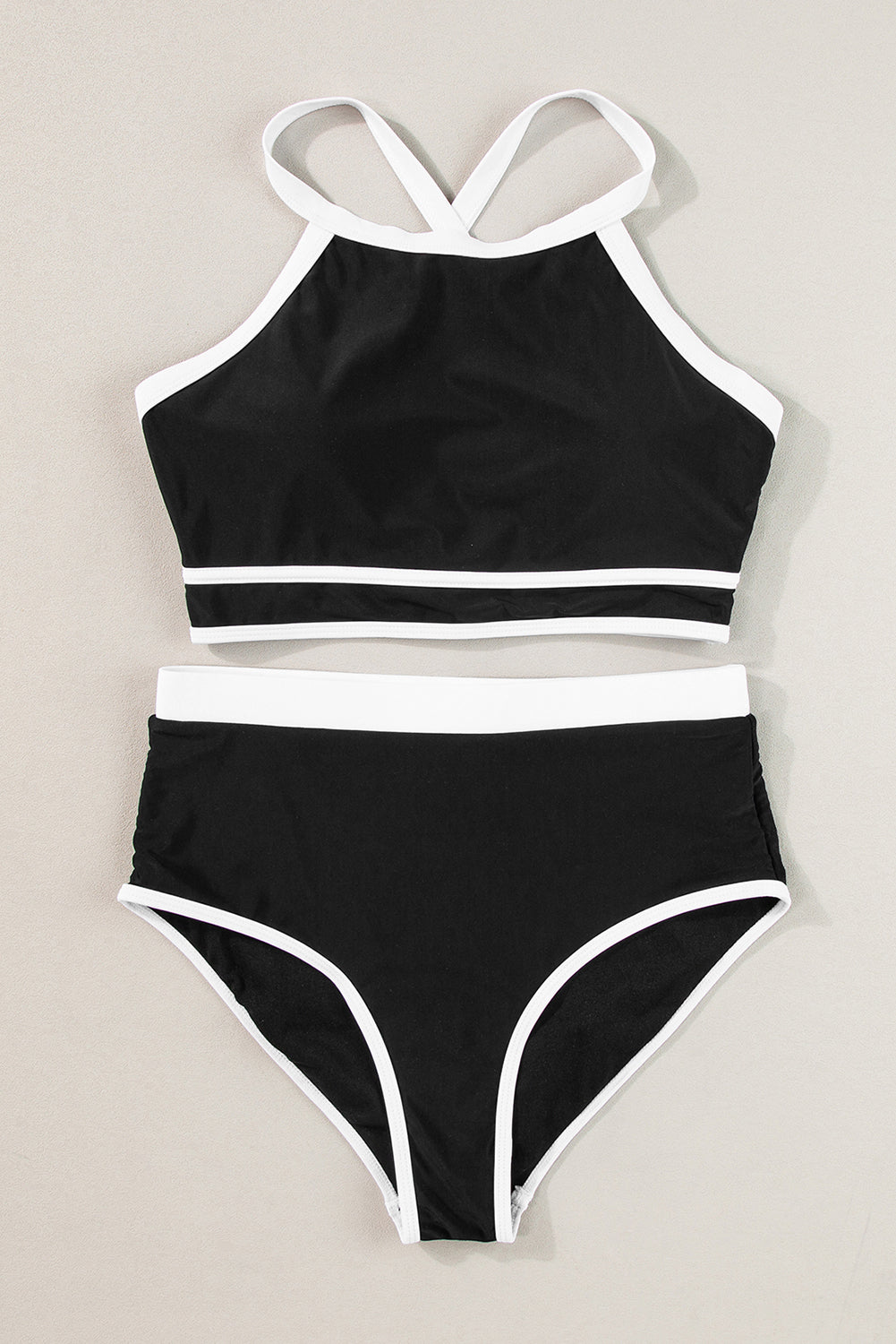 Black Contrast Trim Crisscross Back High Waist Bikini Set