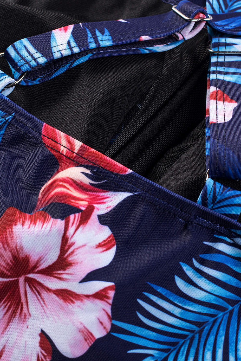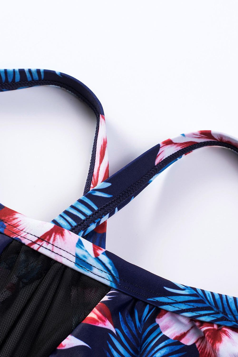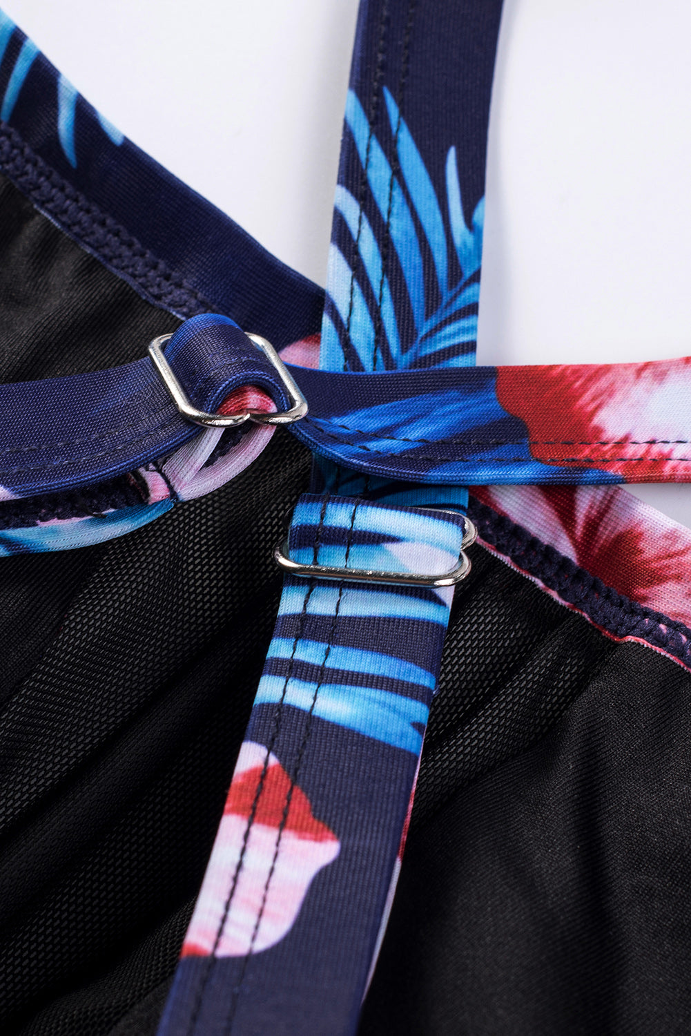 Black Floral Print Mesh Patchwork Criss Cross One-piece Swimsuit