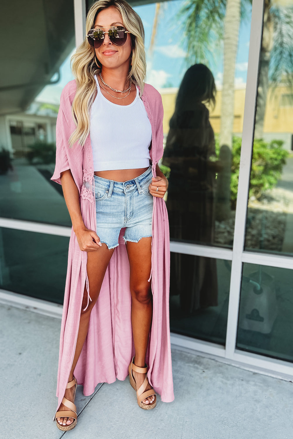 - Gracefully drape yourself in elegance with this flowy kimono boasting a long maxi length for a refined silhouette.
