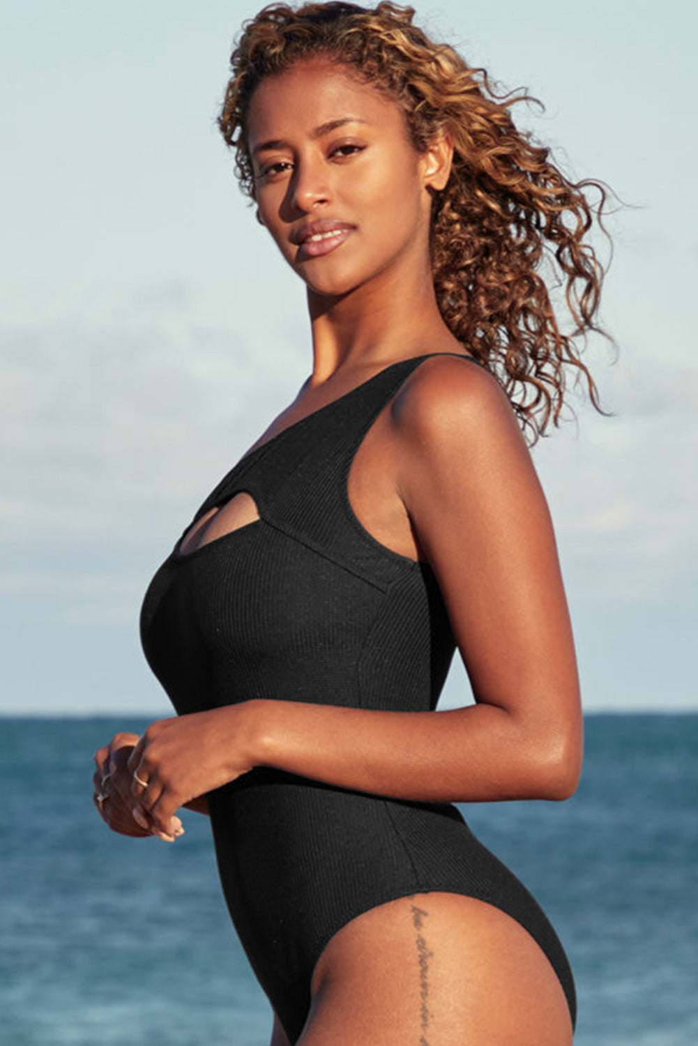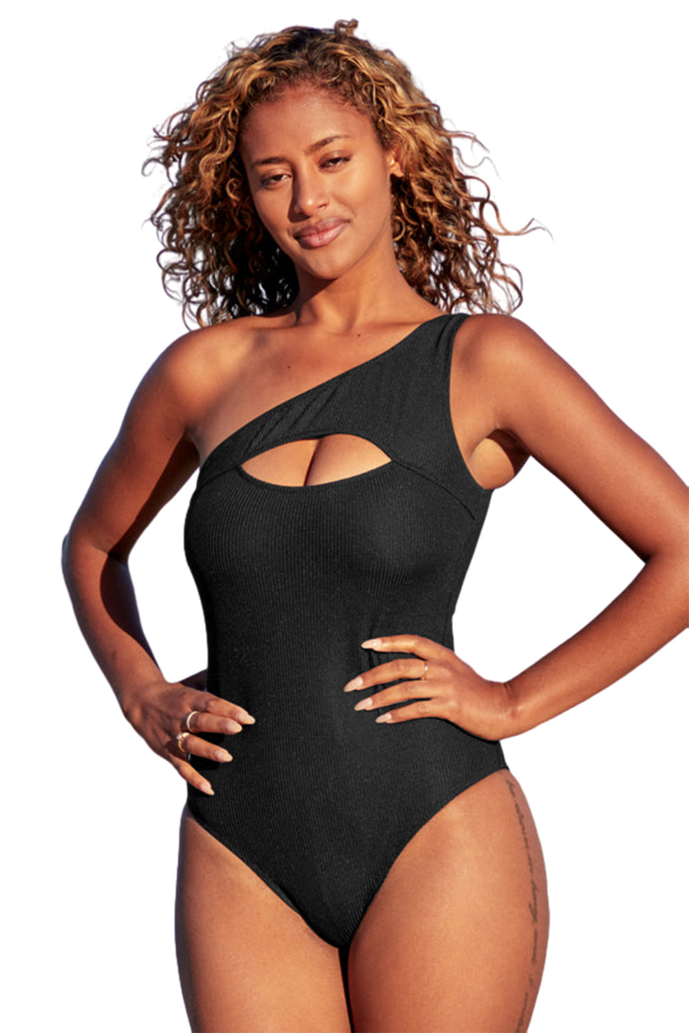 Black Ribbed Hollowed Asymmetric One Piece Swimsuit