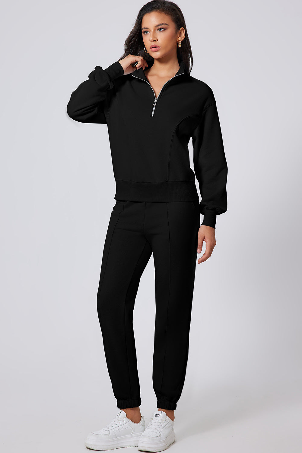 Black Solid Color Half Zip Up Pullover Top and Jogger Set