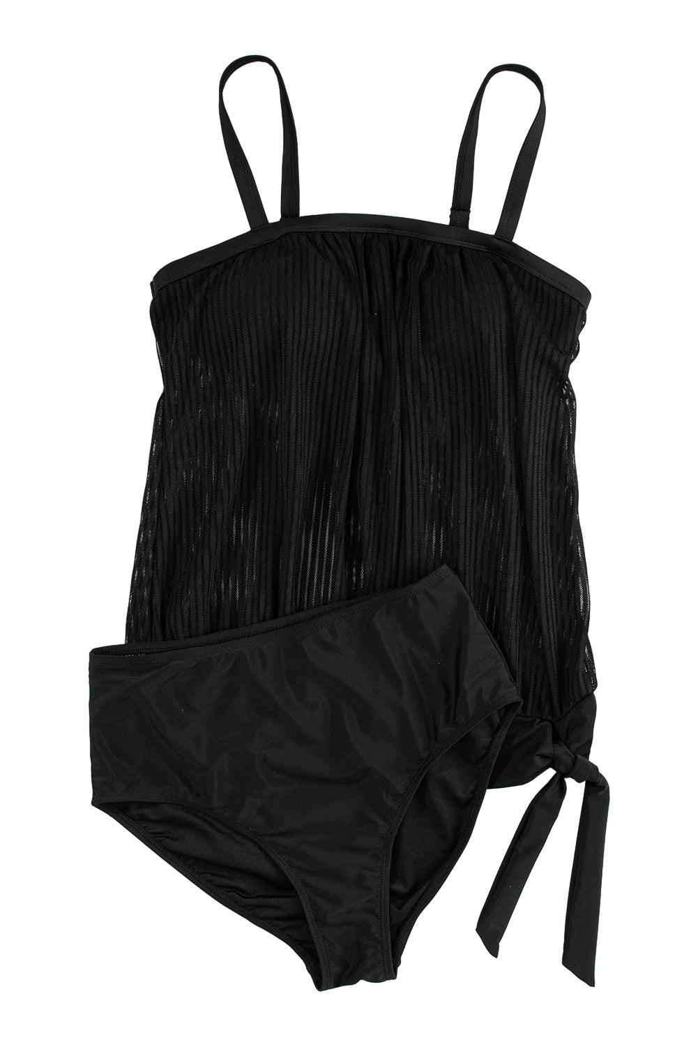 Black Striped Mesh Knotted Hem Tankini Swimsuit