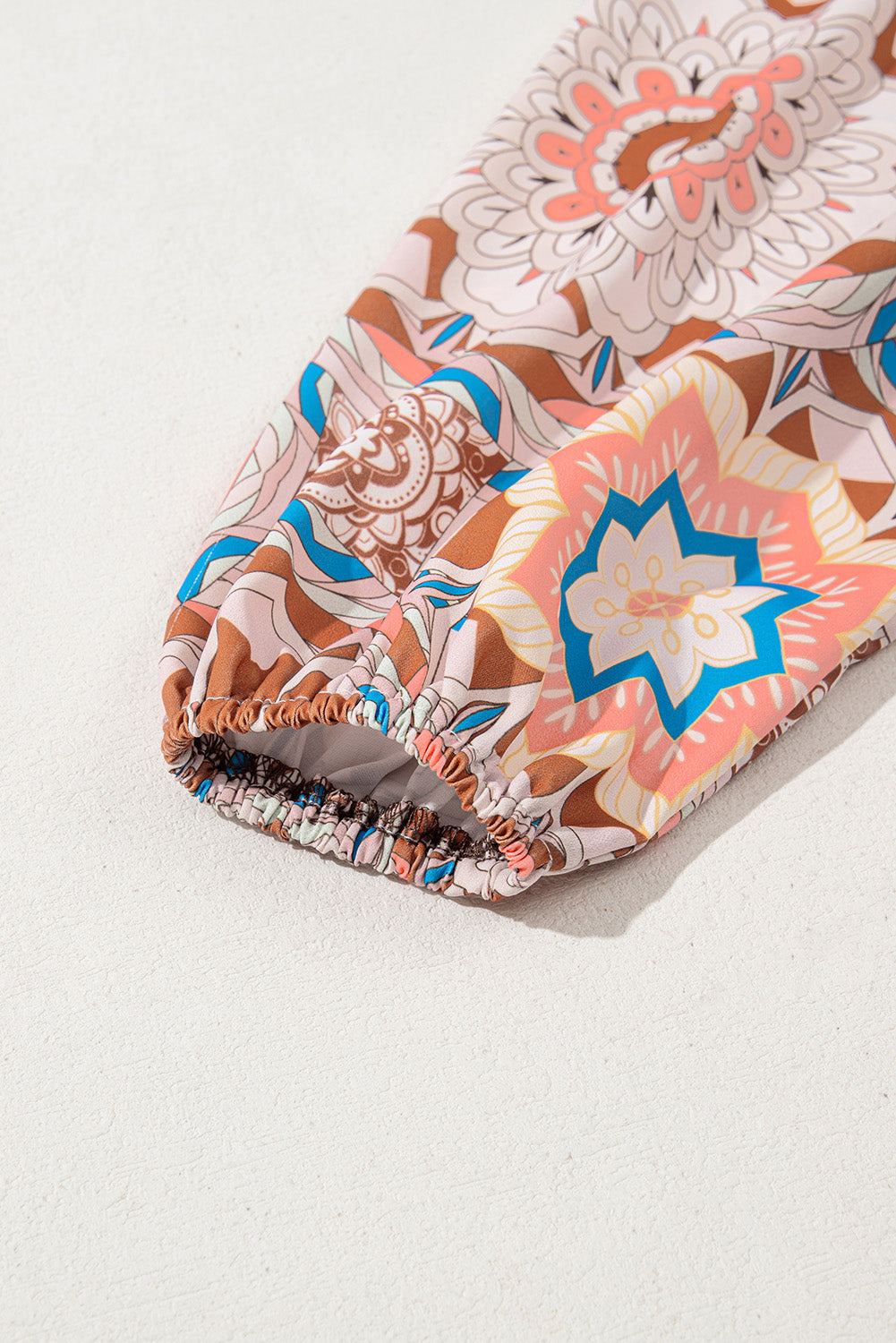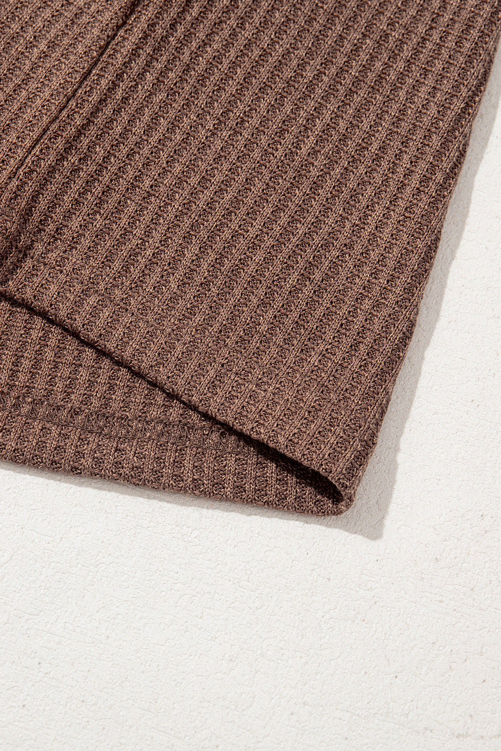 Coffee Ruffle Floral Sleeve Patchwork Waffle Top