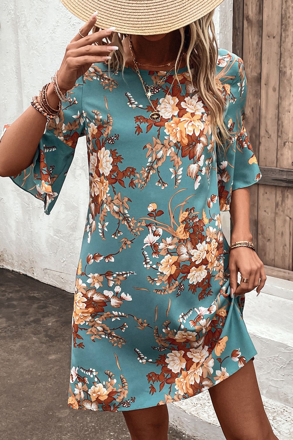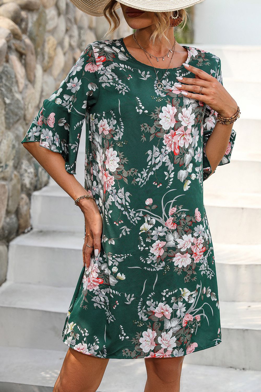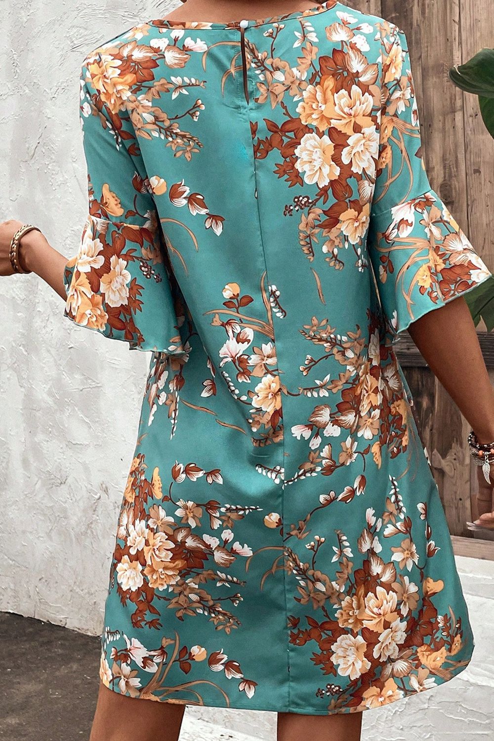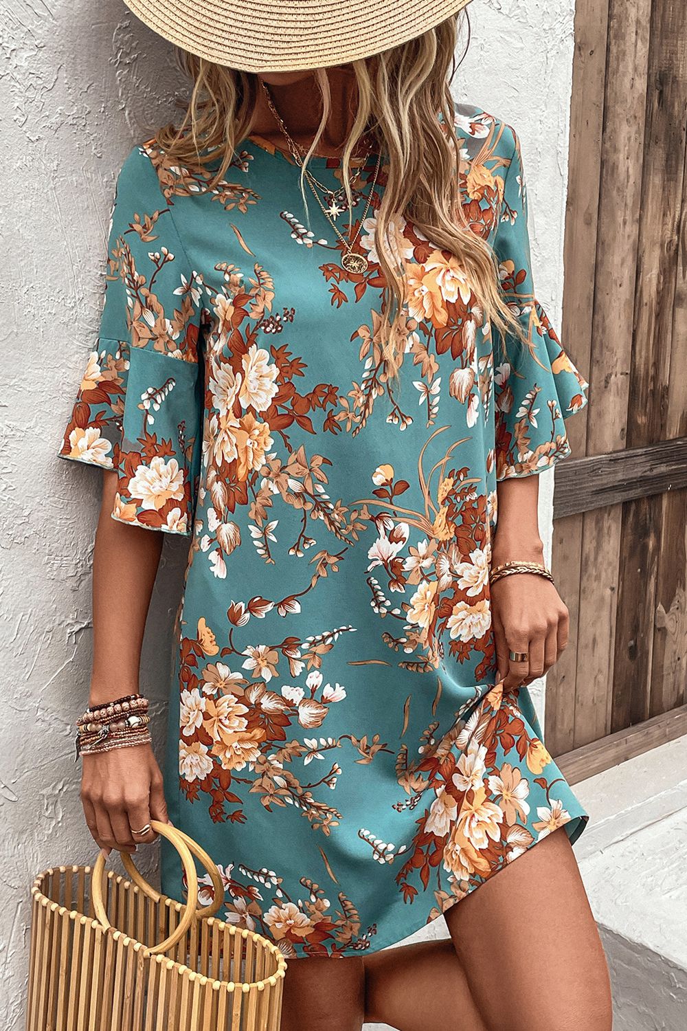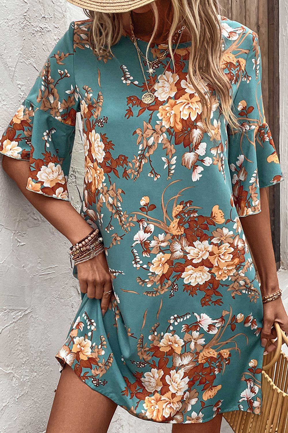 Floral Print Round Neck Flounce Sleeve Mini Dress