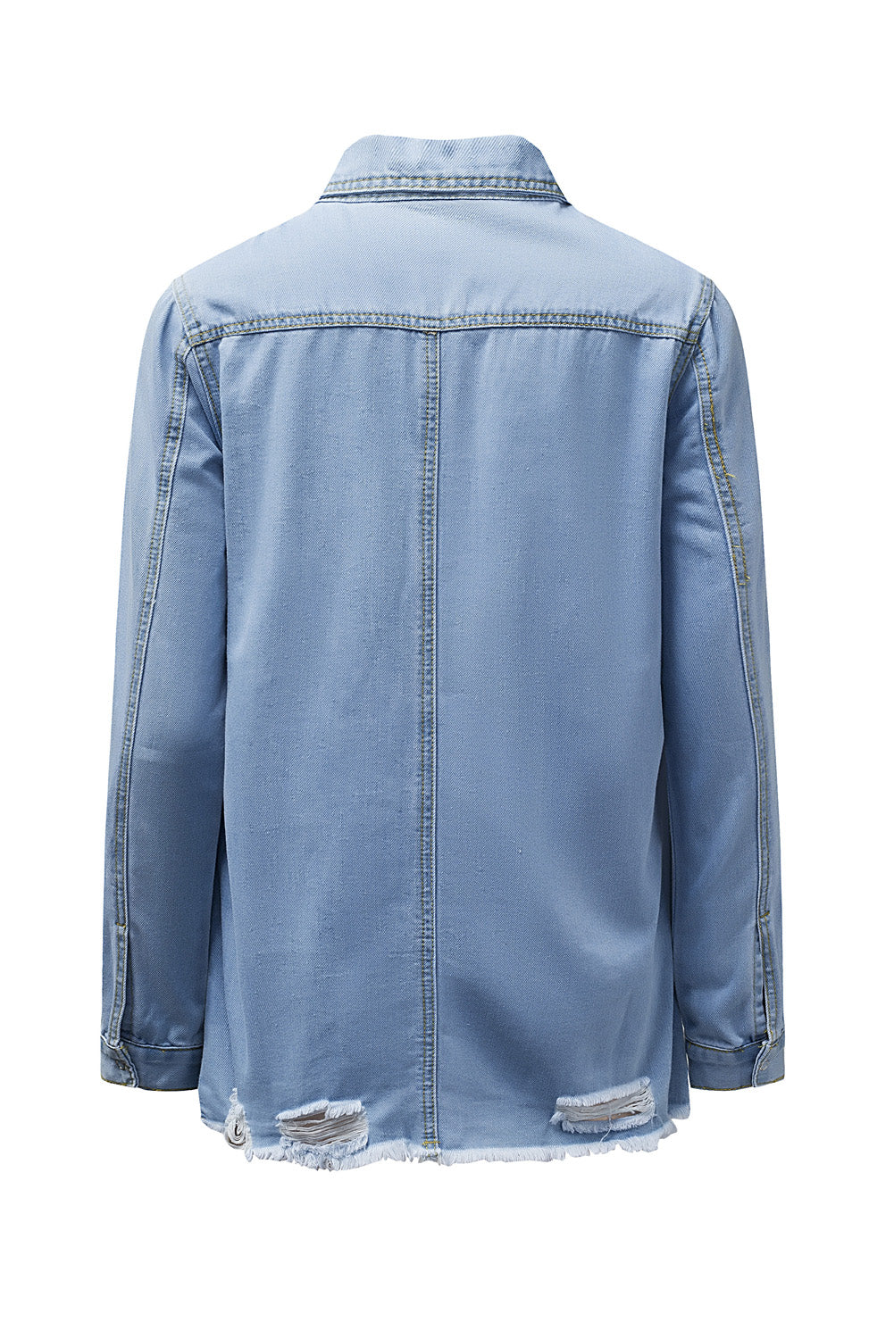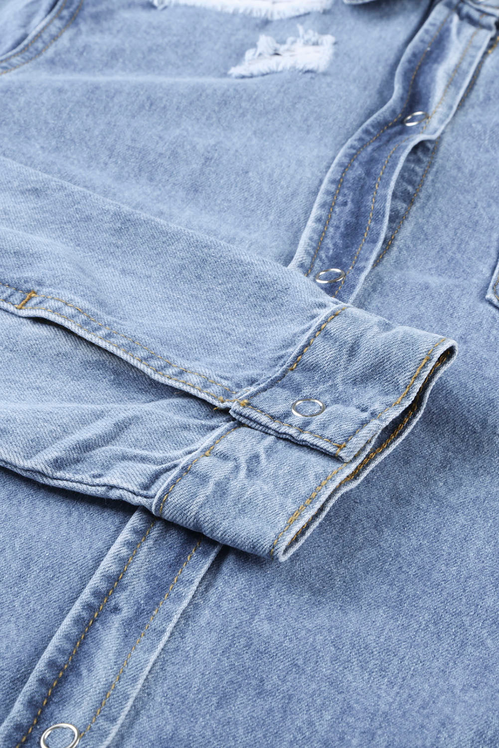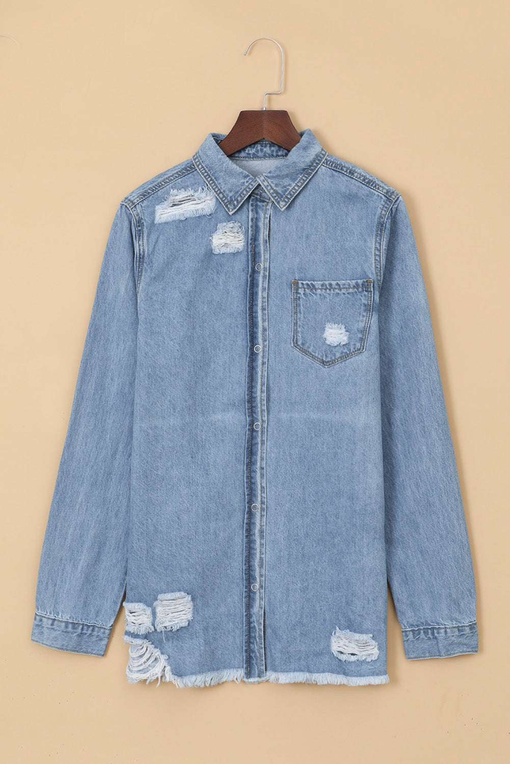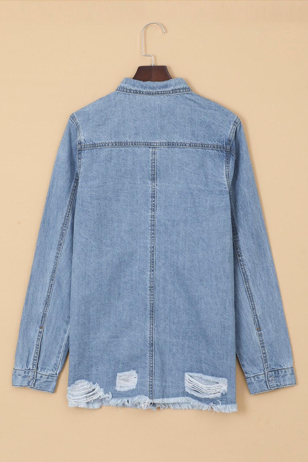 Green Casual Ripped Raw Hem Button Up Denim Shacket