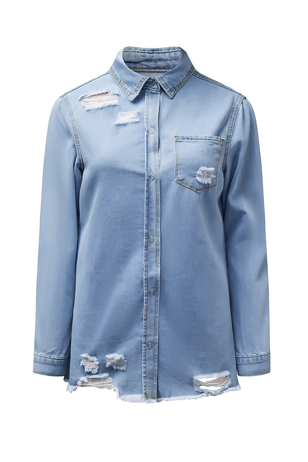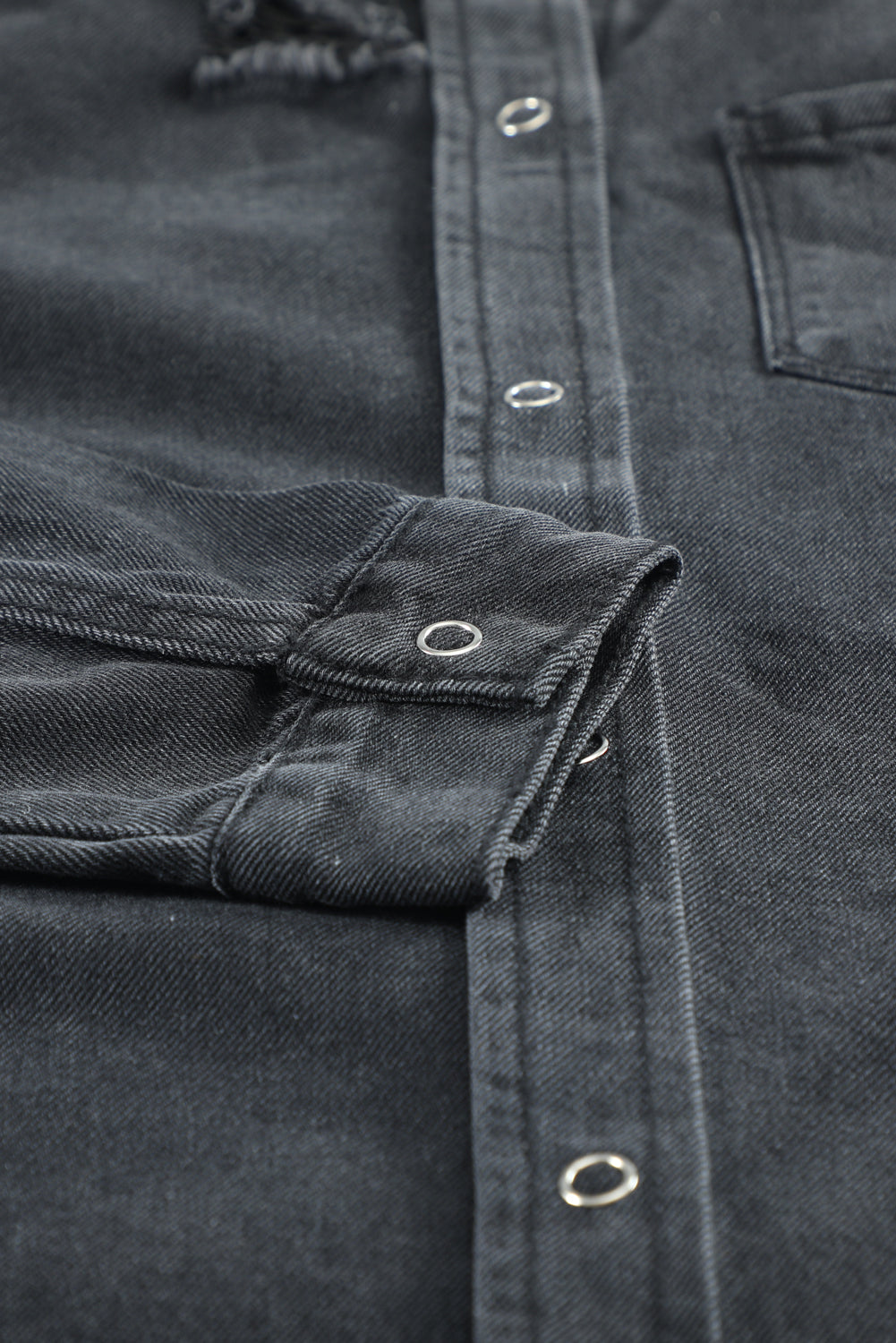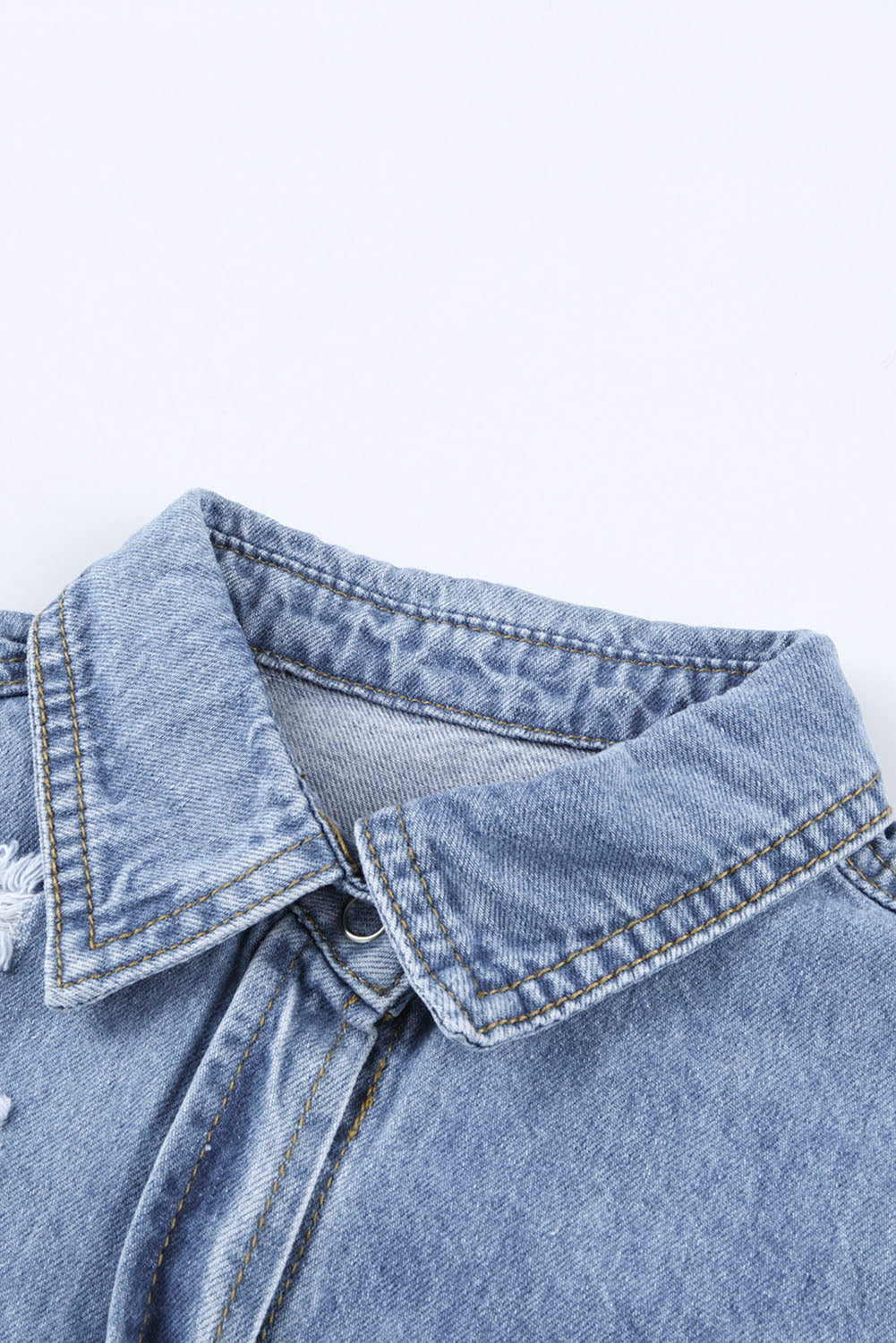 Green Casual Ripped Raw Hem Button Up Denim Shacket