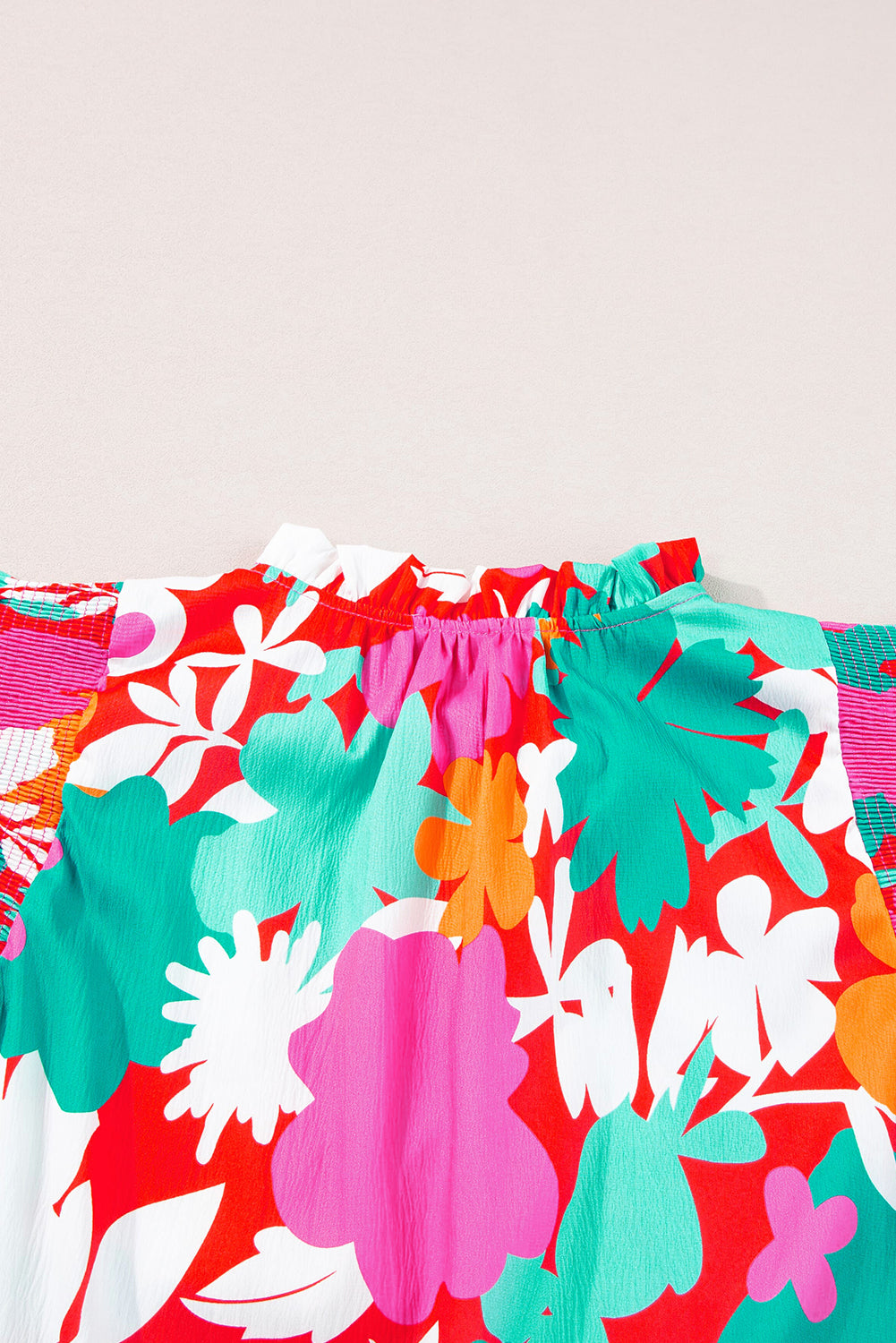 Green Floral Tie Split Neck Ruffle Trim Blouse