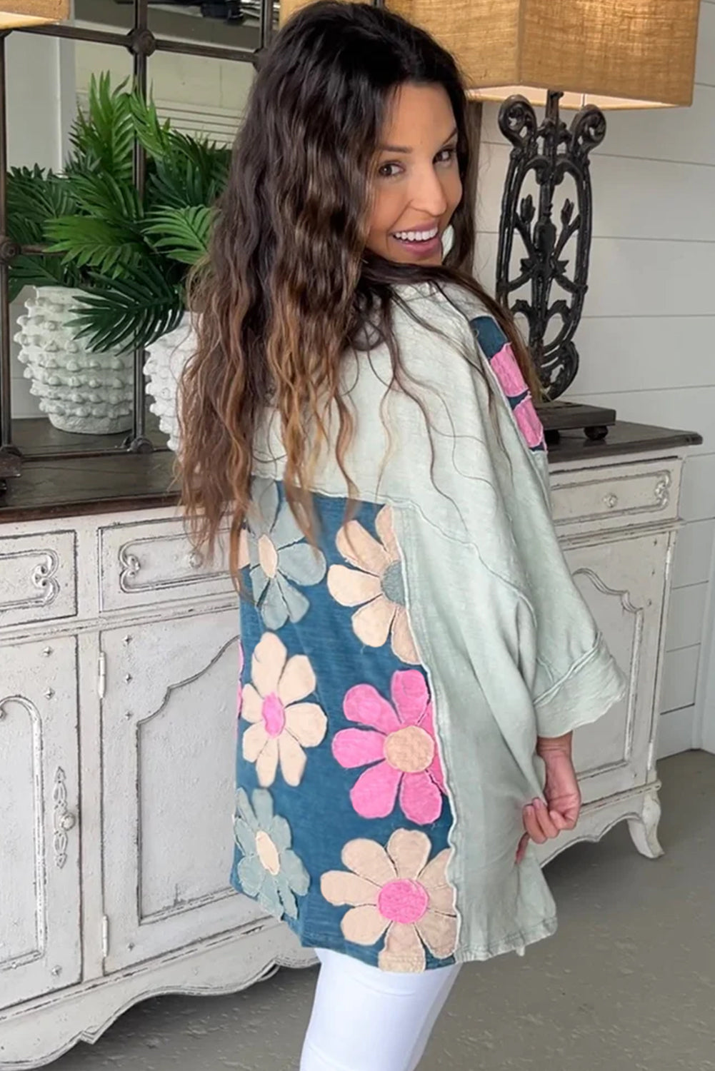 Green Patchwork Floral V Neck Bracelet Sleeve Blouse