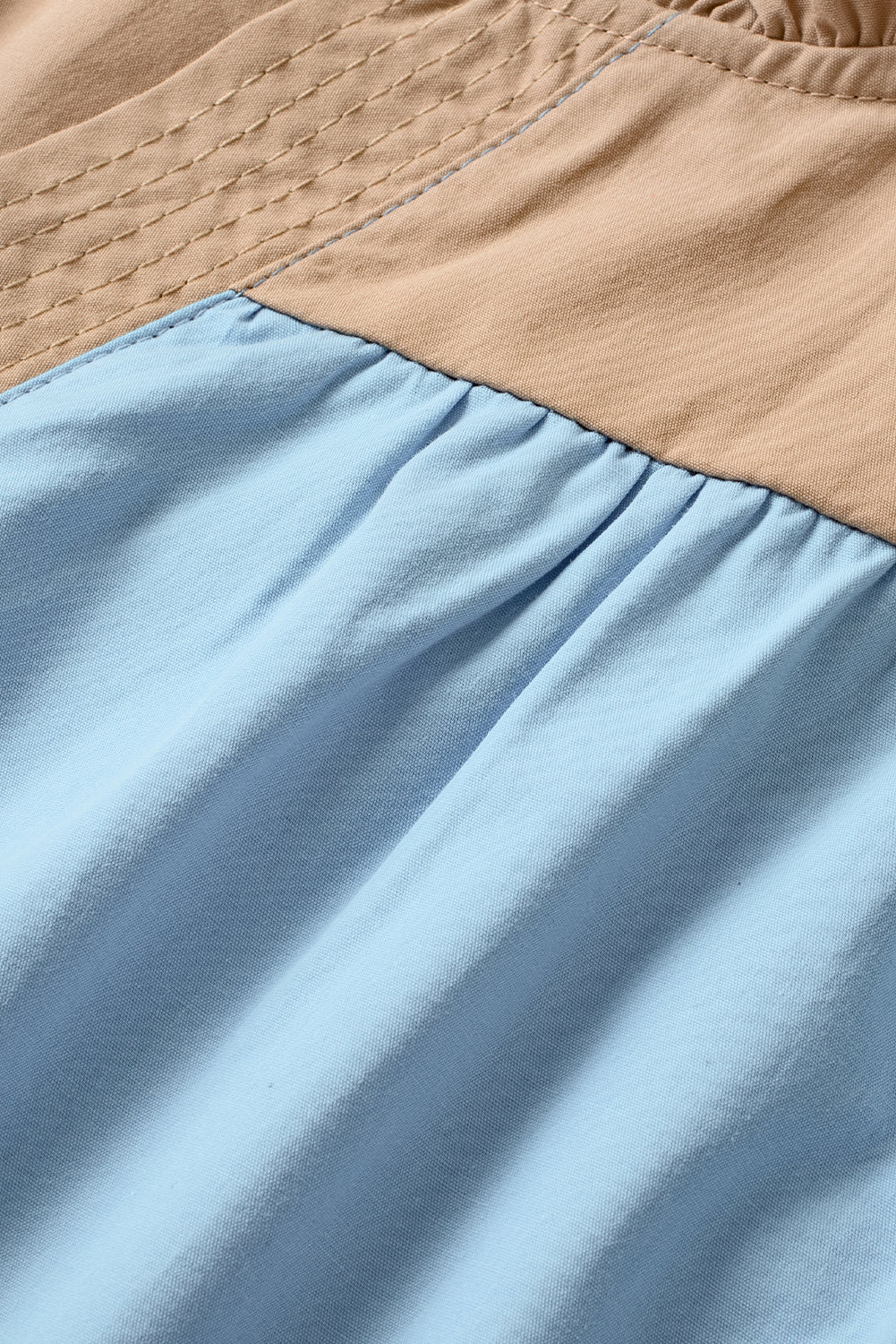 Mist Blue Colorblock Ruffled Sleeve Frill V Neck Blouse