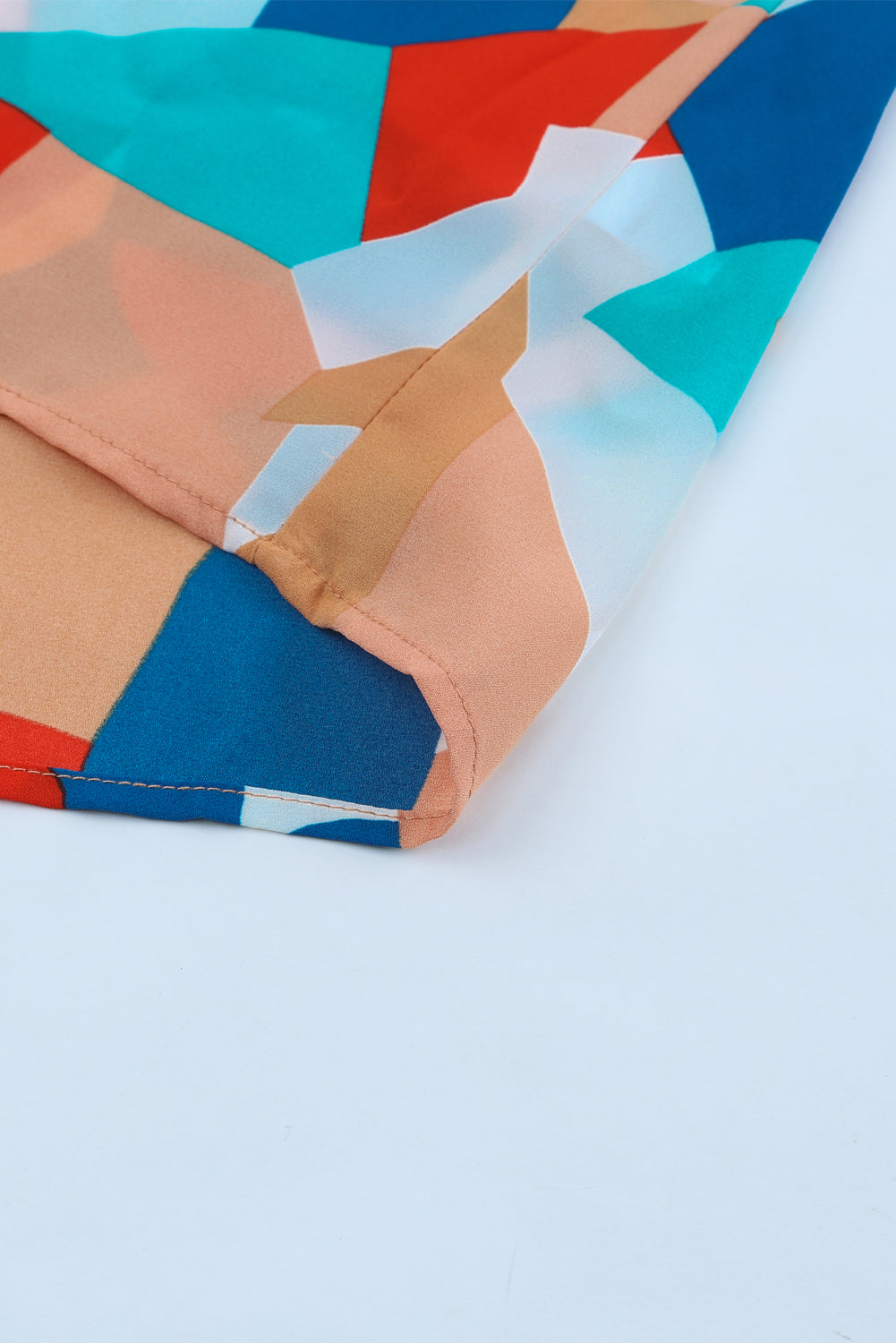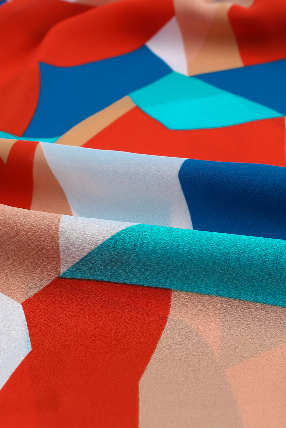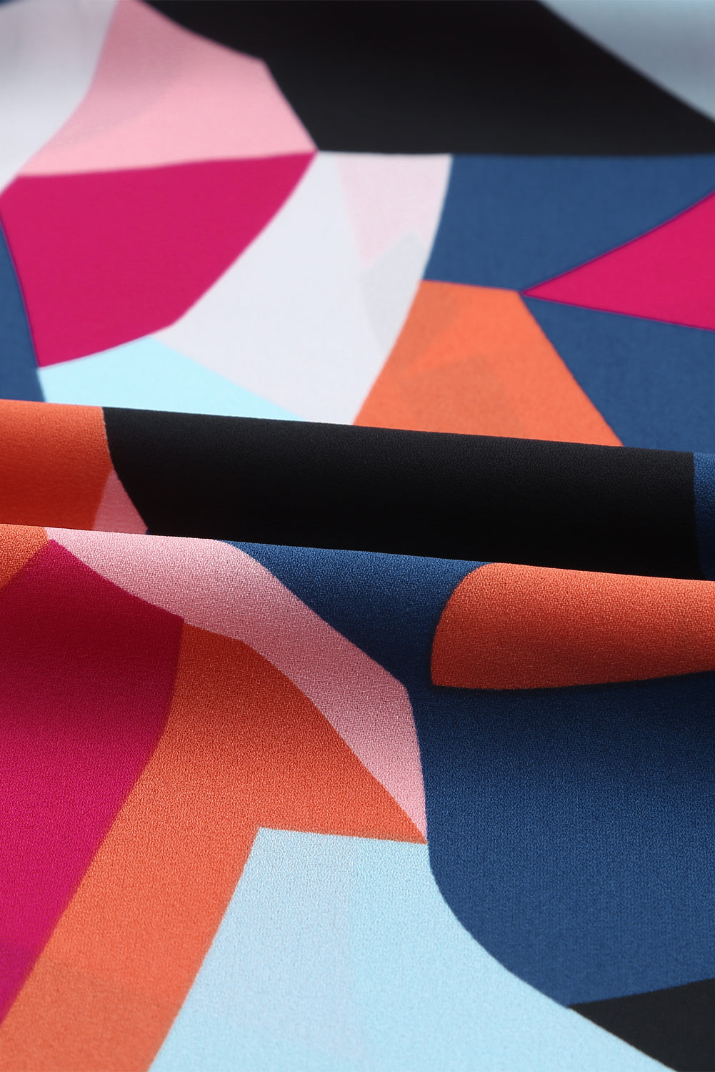 •An artful abstract pattern bursts with bold color on this light and airy blouse.