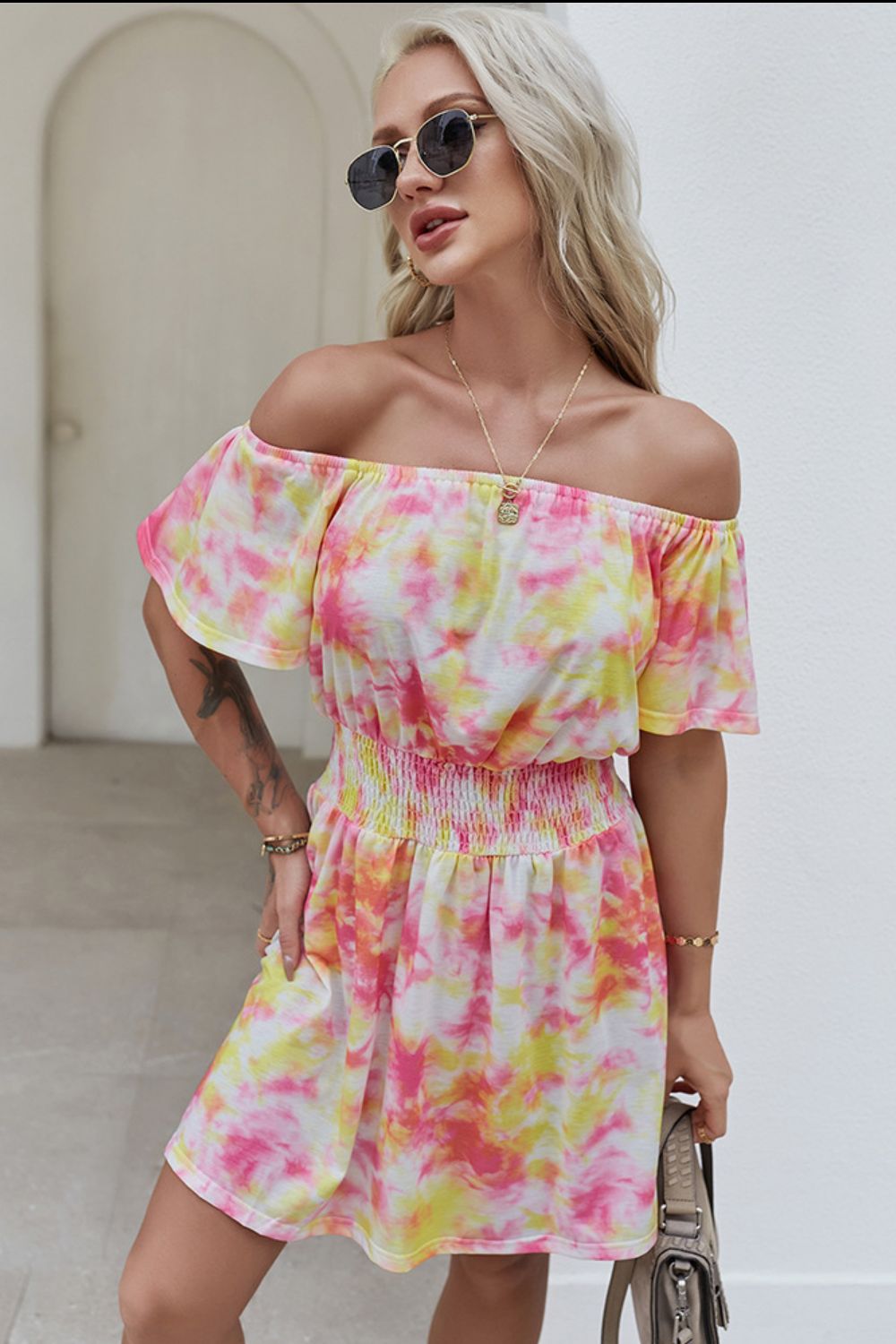 - Neckline: Off-shoulder