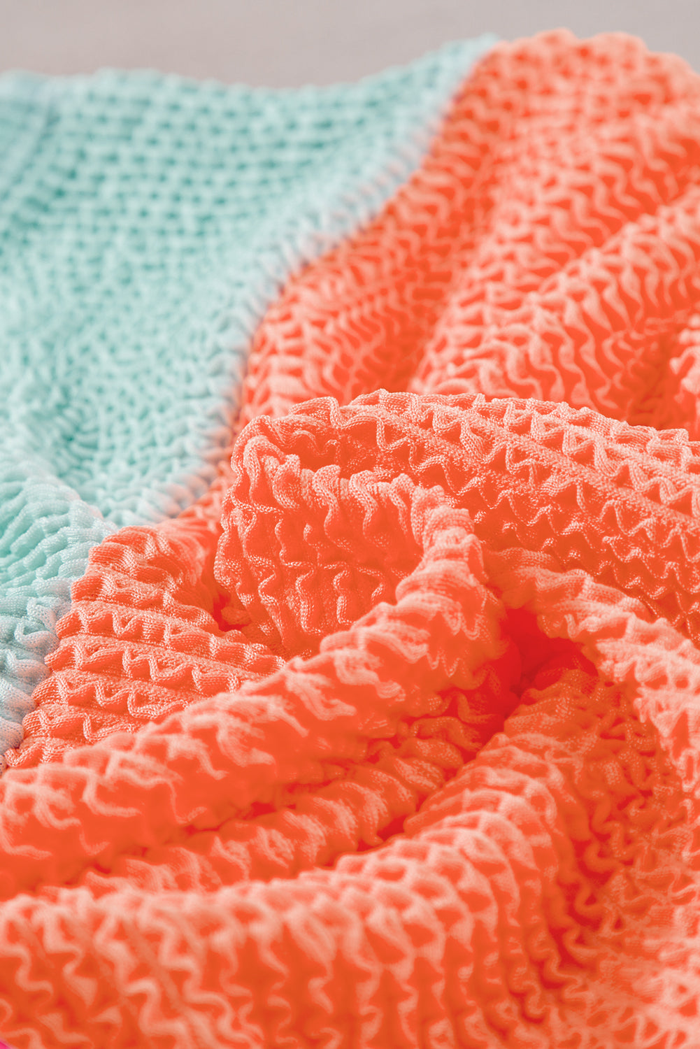 • Vibrant and eye-catching grapefruit orange color blocking design makes a bold statement on the beach.