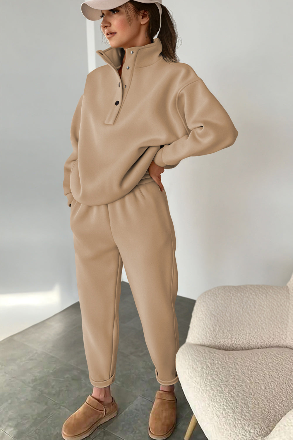 Parchment Solid Half Button Sweatshirt and High Waist Pants Set