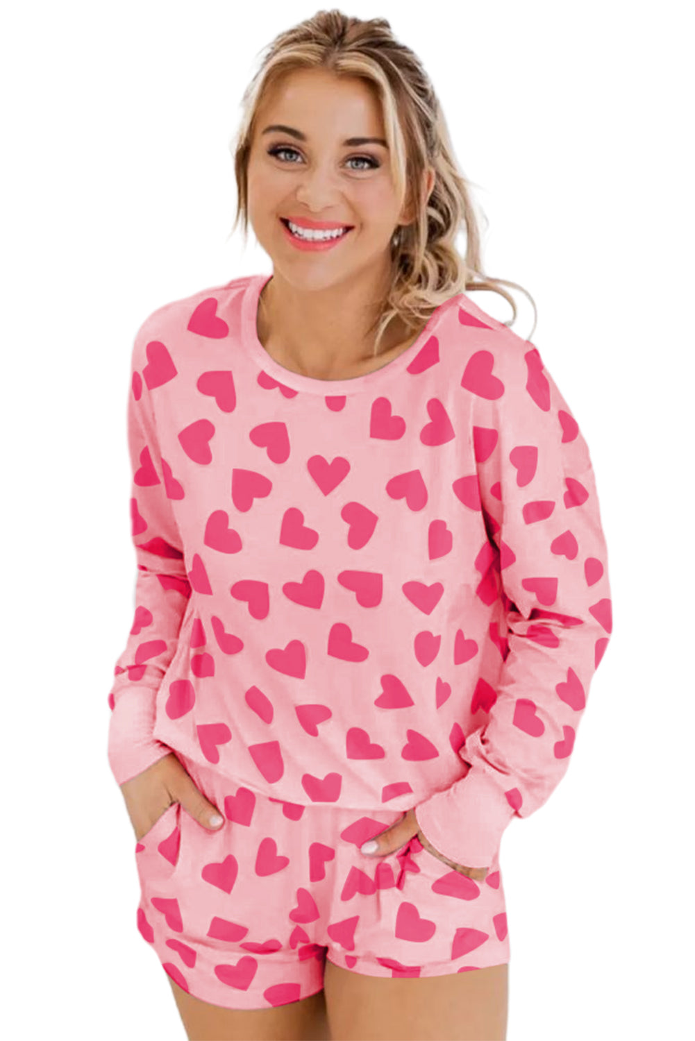 Pink Heart Print Long Sleeve Top and Shorts Loungewear Set