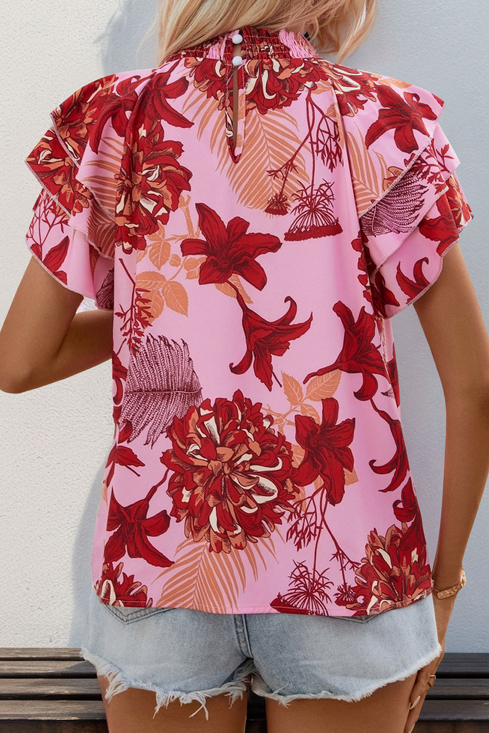 Pink Ruffle Layered Sleeve Smocked Keyhole Neck Blouse