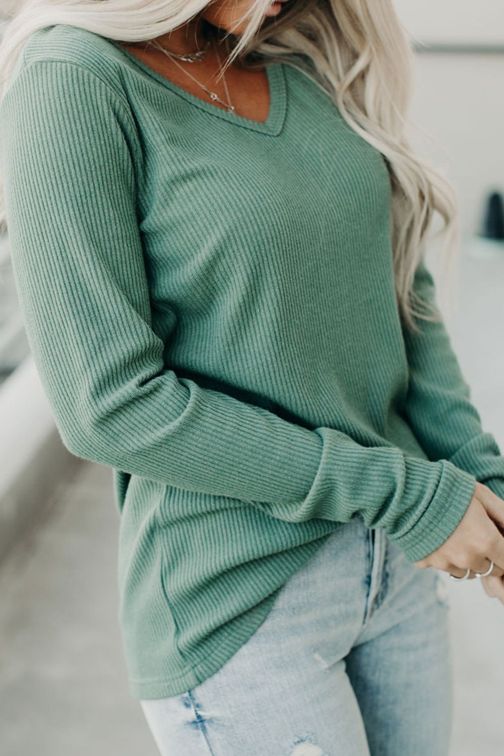 Ribbed V-Neck Long Sleeve T-Shirt