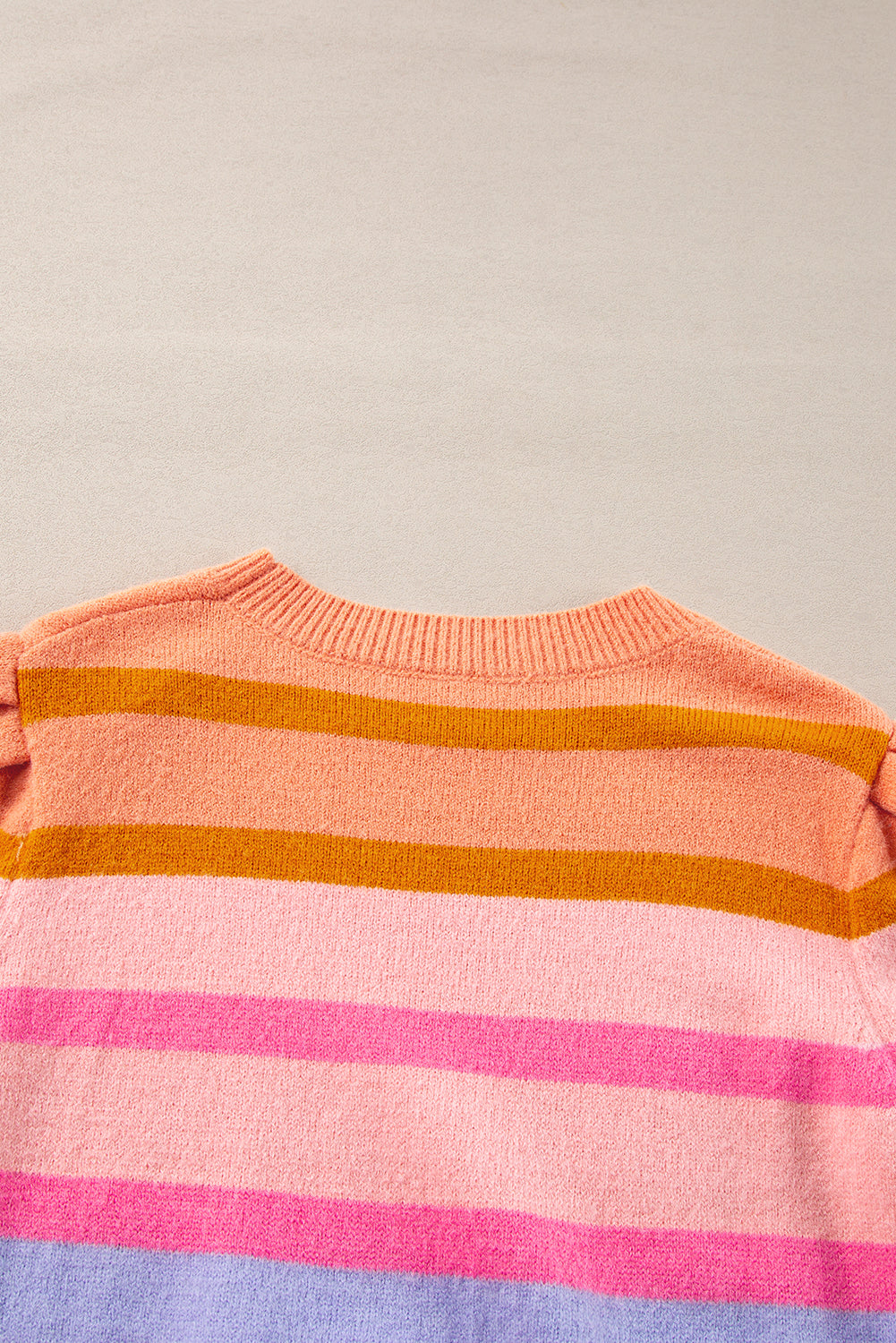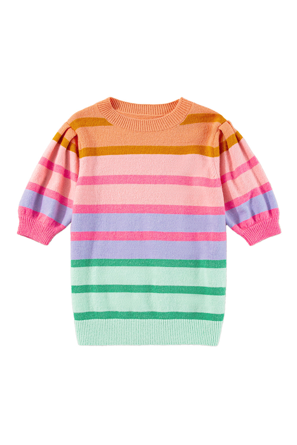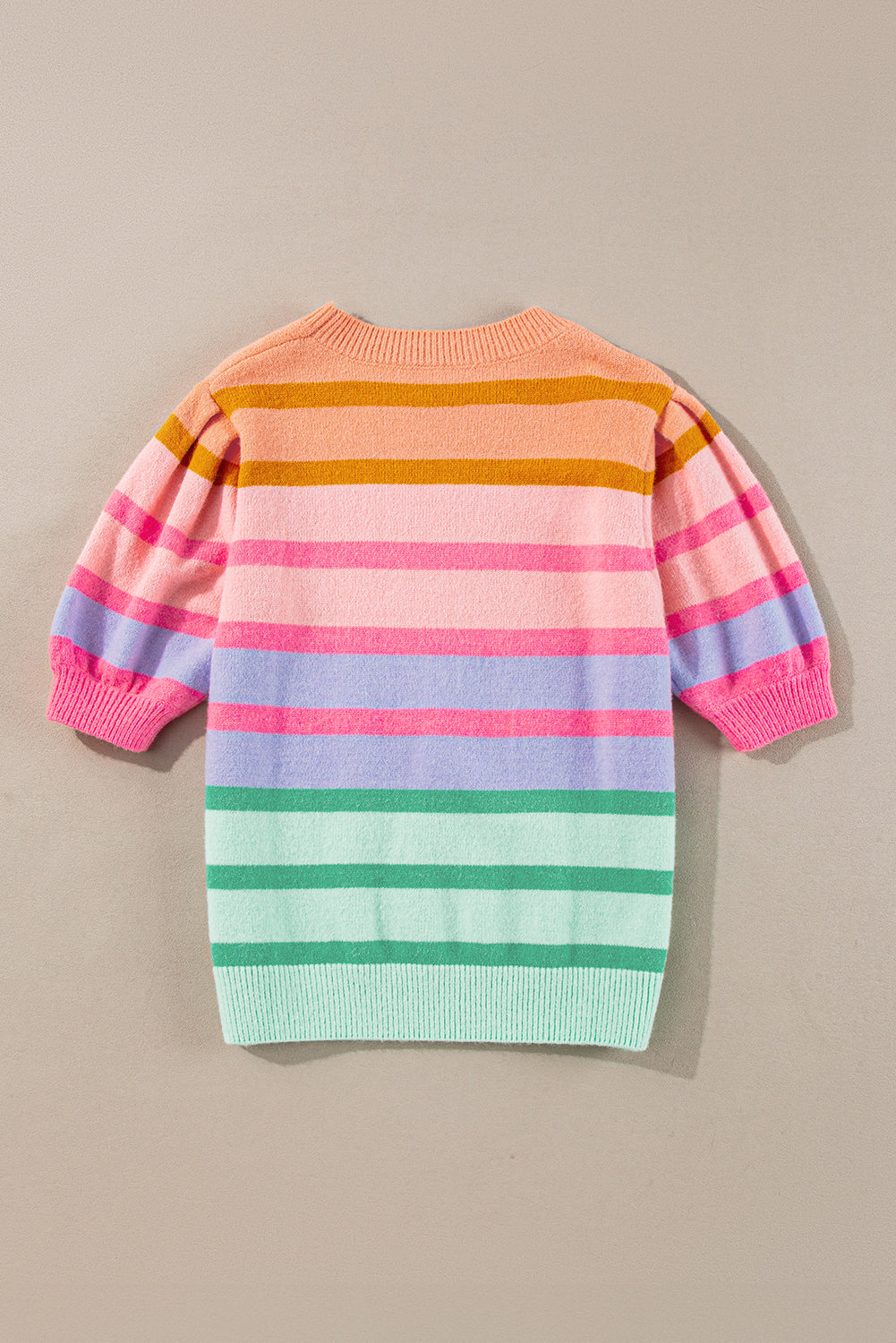 Rose Red Colourful Stripe Bubble Sleeve Gradient Knit Top