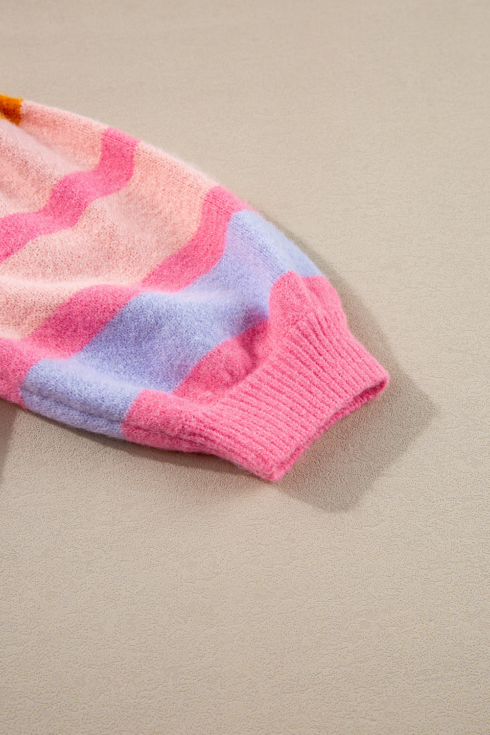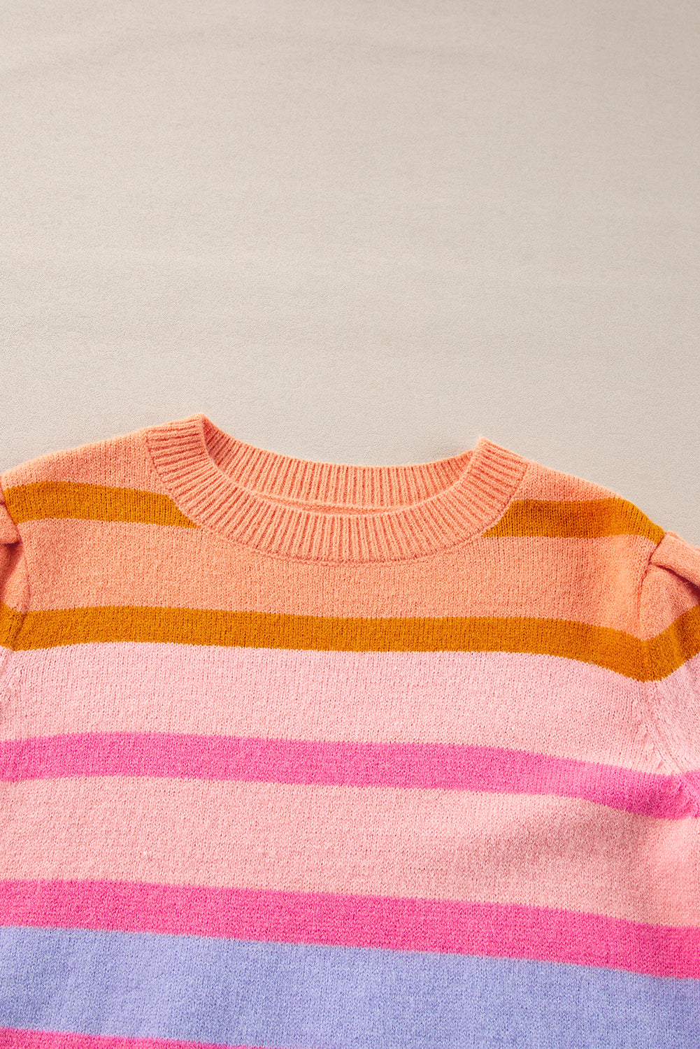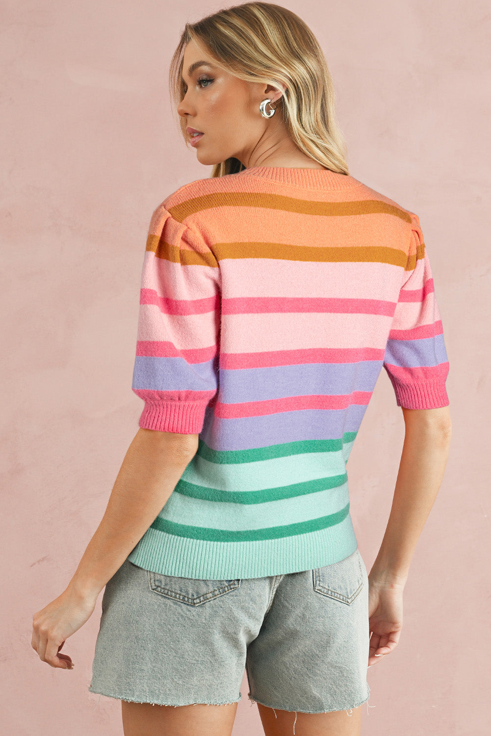 Rose Red Colourful Stripe Bubble Sleeve Gradient Knit Top