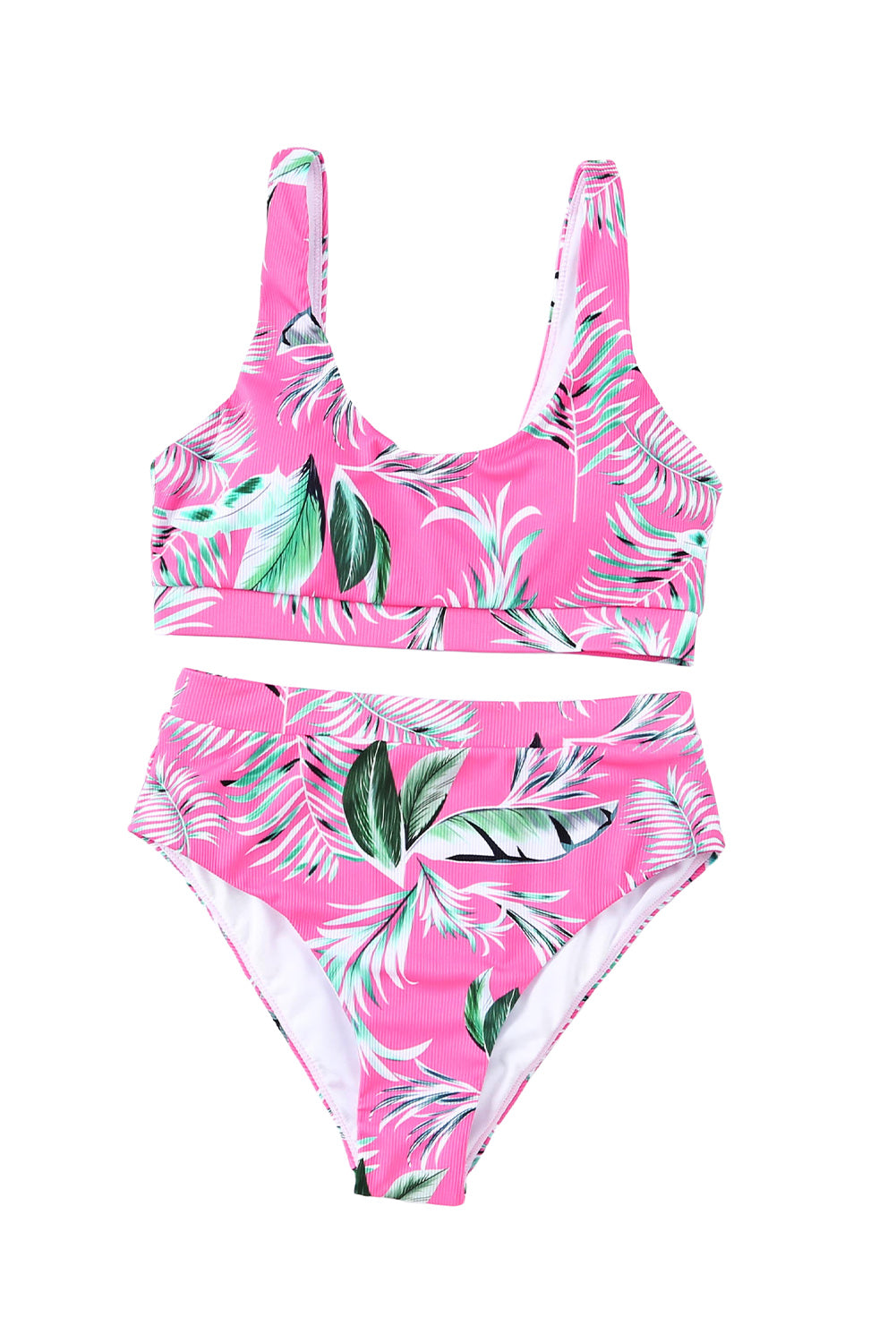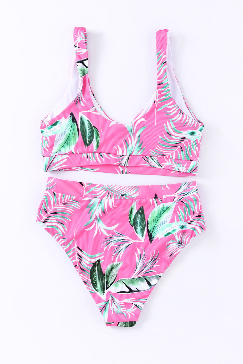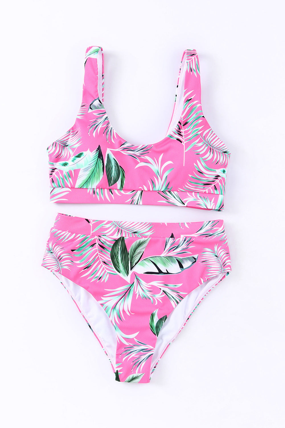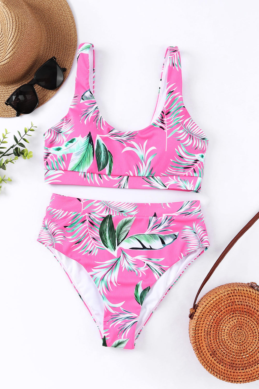 Rose Tropical Scoop Neck Ribbed High Waist Bikini Set