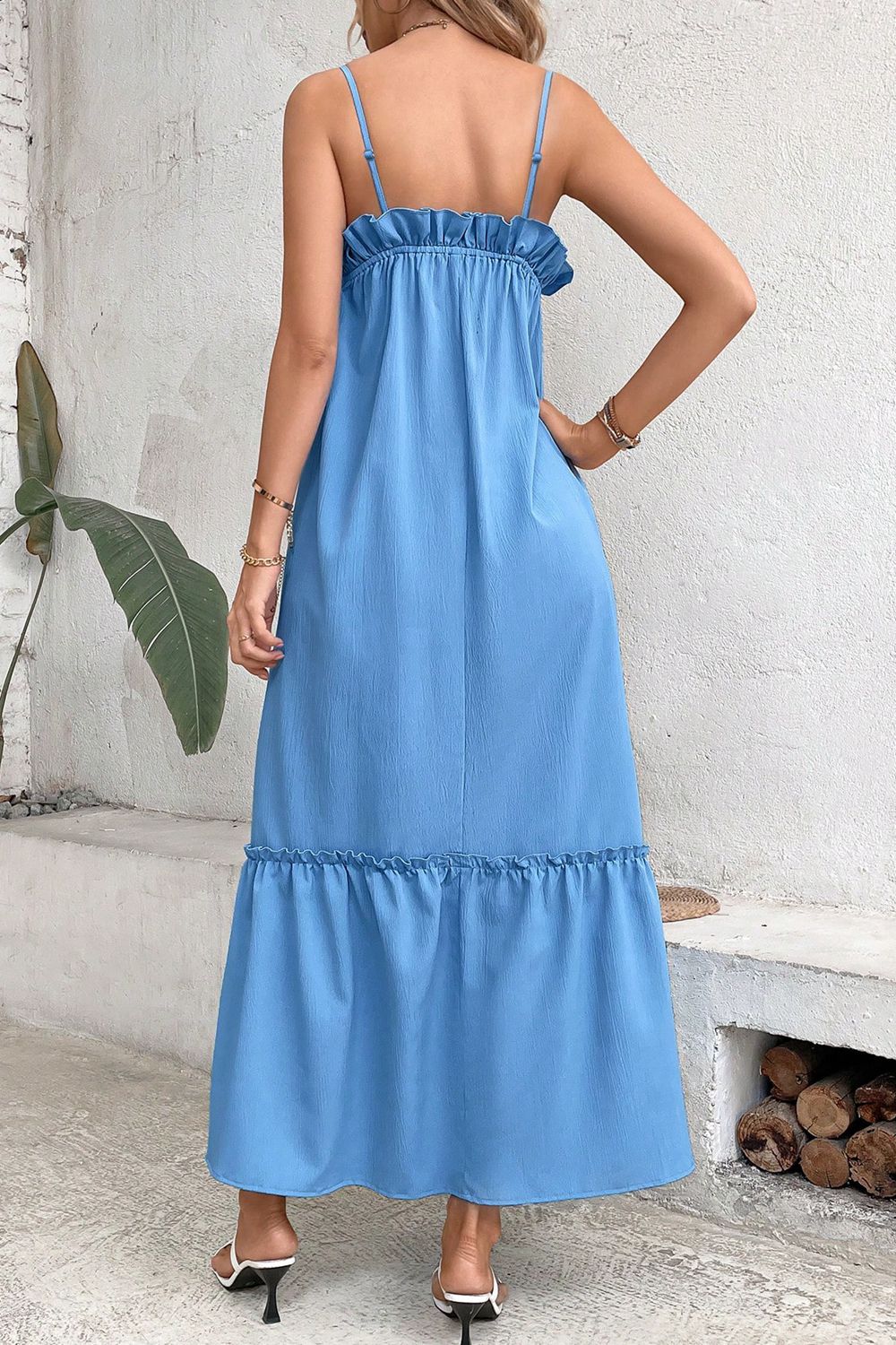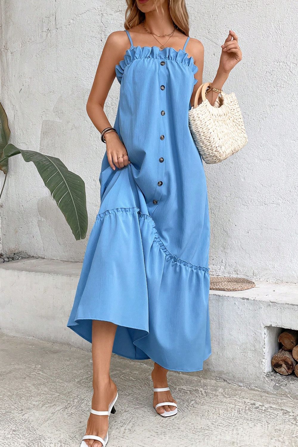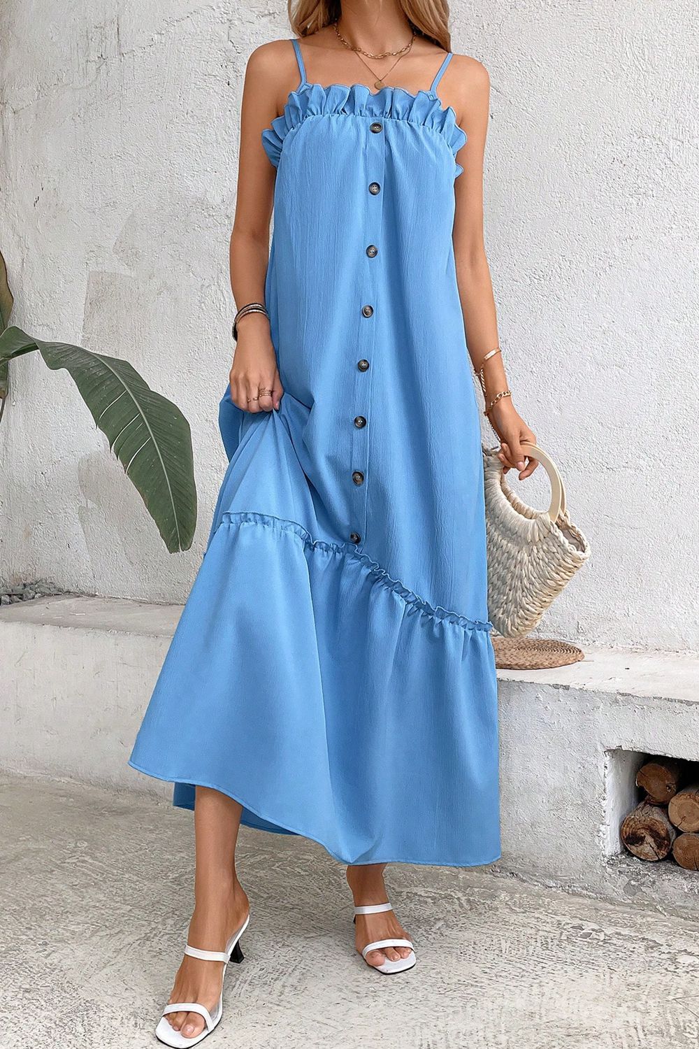 Ruffle Trim Buttoned Sleeveless Maxi Dress