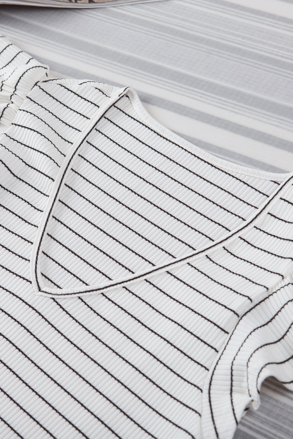 Ruffled Striped V-Neck Cap Sleeve Blouse