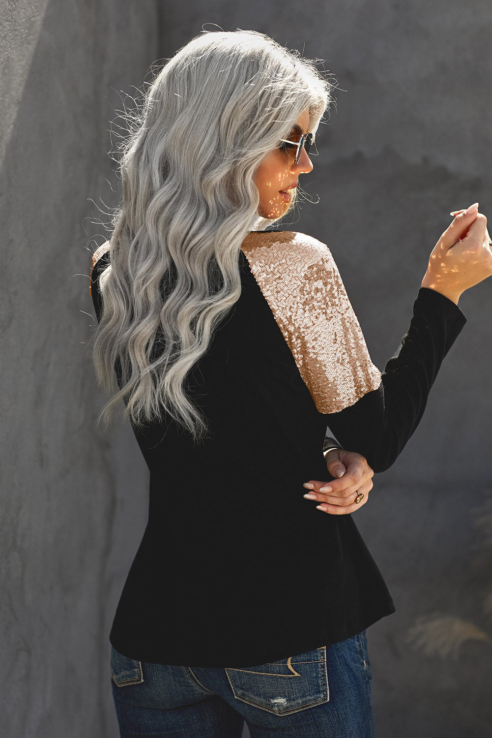 The raglan sleeves with sequin shoulder design add to a glamorous and sparkling look. You can match it with jeans, skirts.