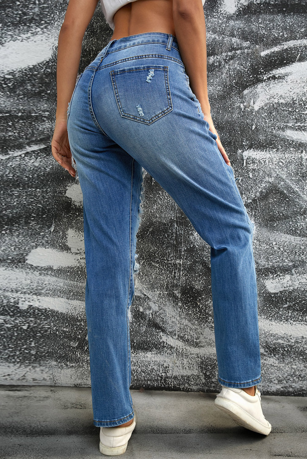 Sky Blue Sequin Rugby Football Patchwork Distressed Straight Leg Jeans