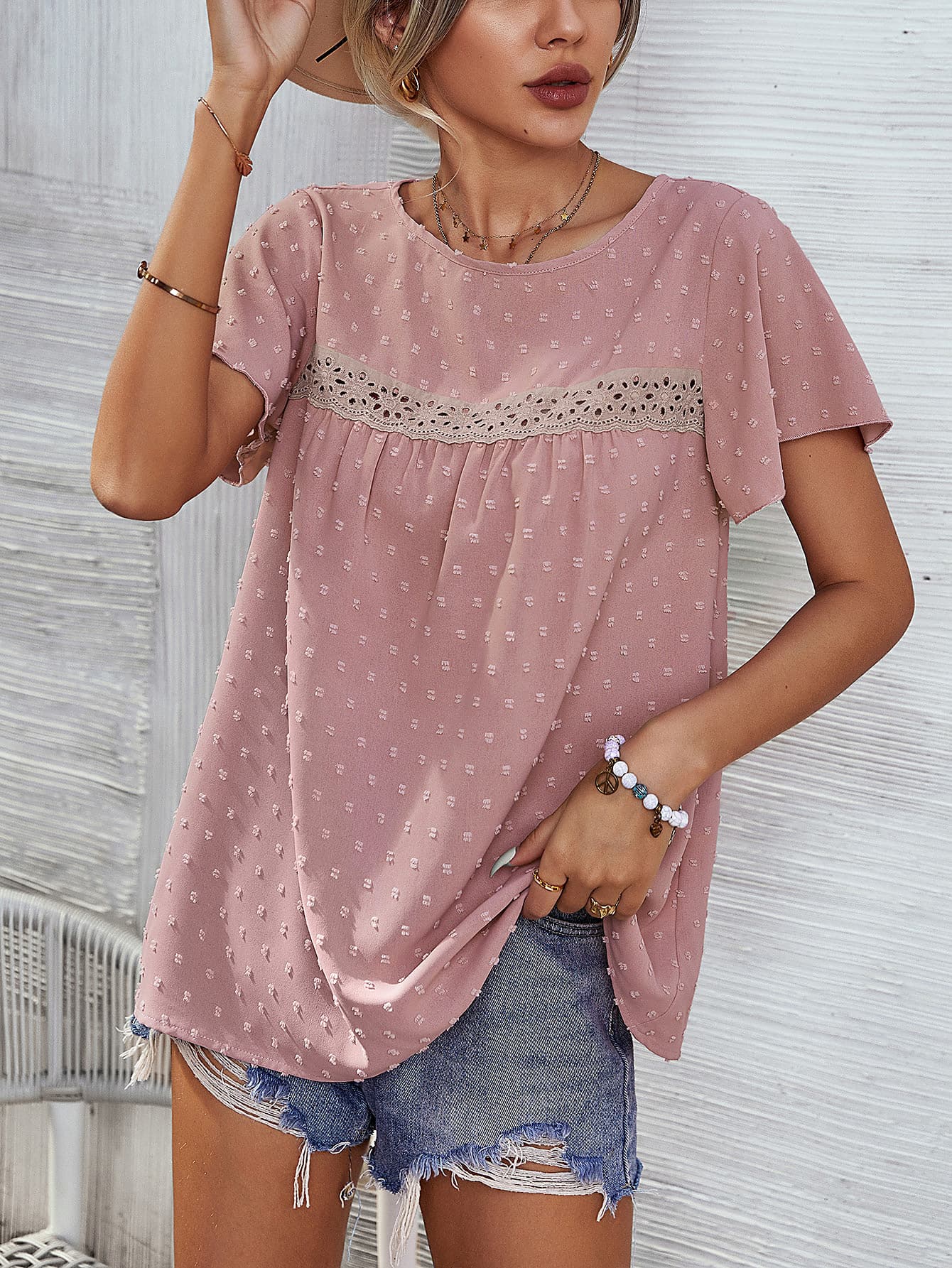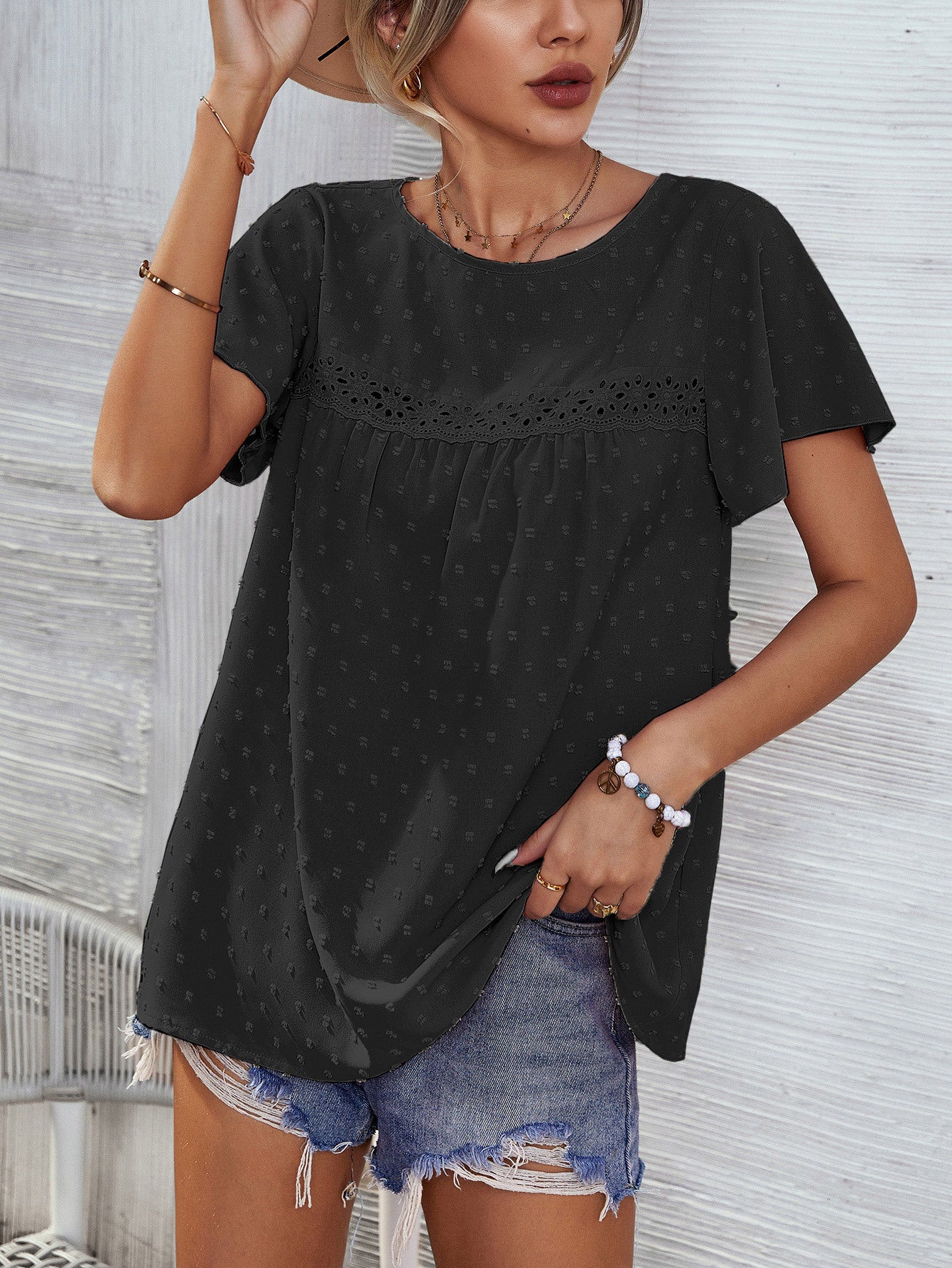 Swiss Dot Round Neck Flutter Sleeve Blouse