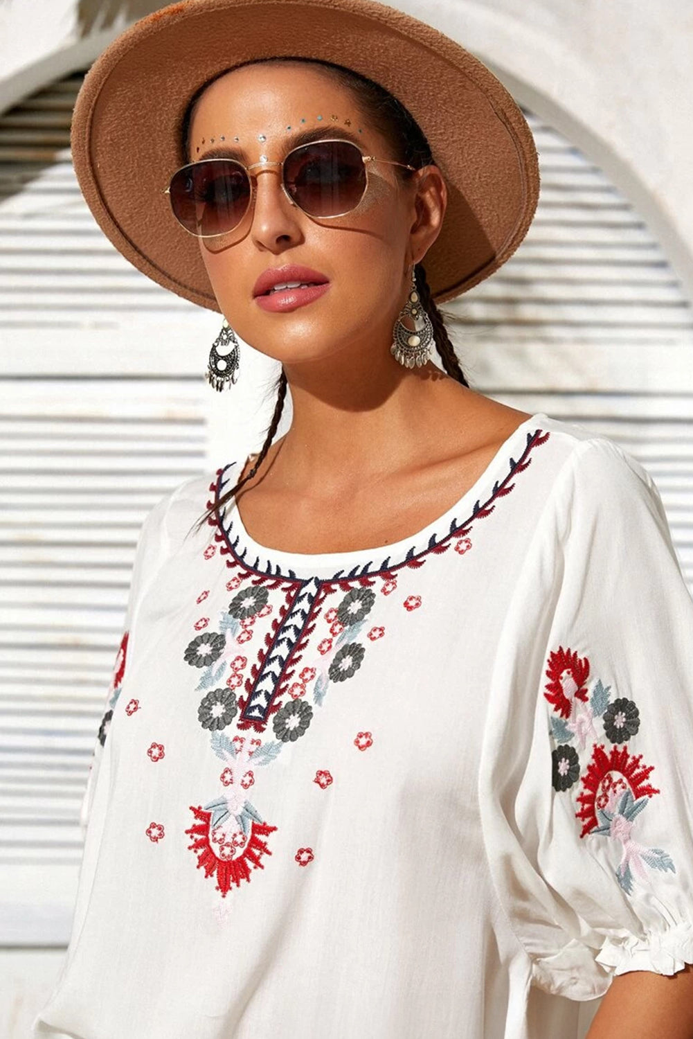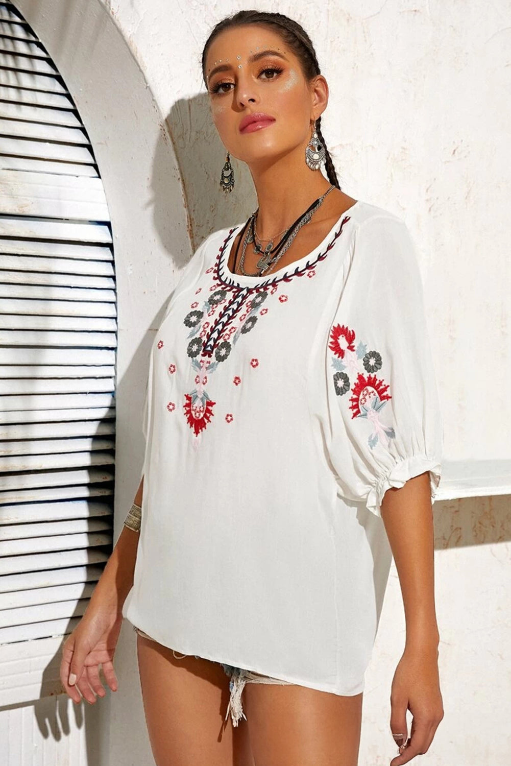 White Boho Embroidered Round Neck Half Sleeve Blouse