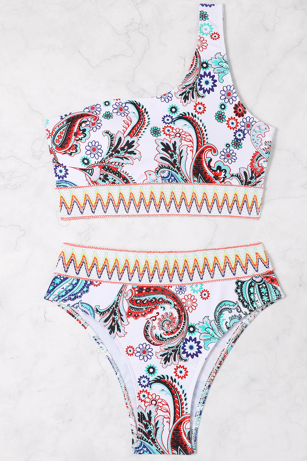 White Boho Paisley Contrast Trimmed One Shoulder Bikini