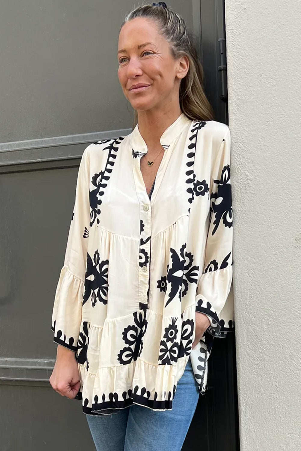 • The intricate boho abstract print adds a unique and artistic flair to this blouse, making it a standout piece for casual or dressy occasions.