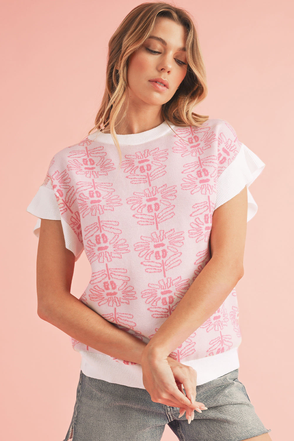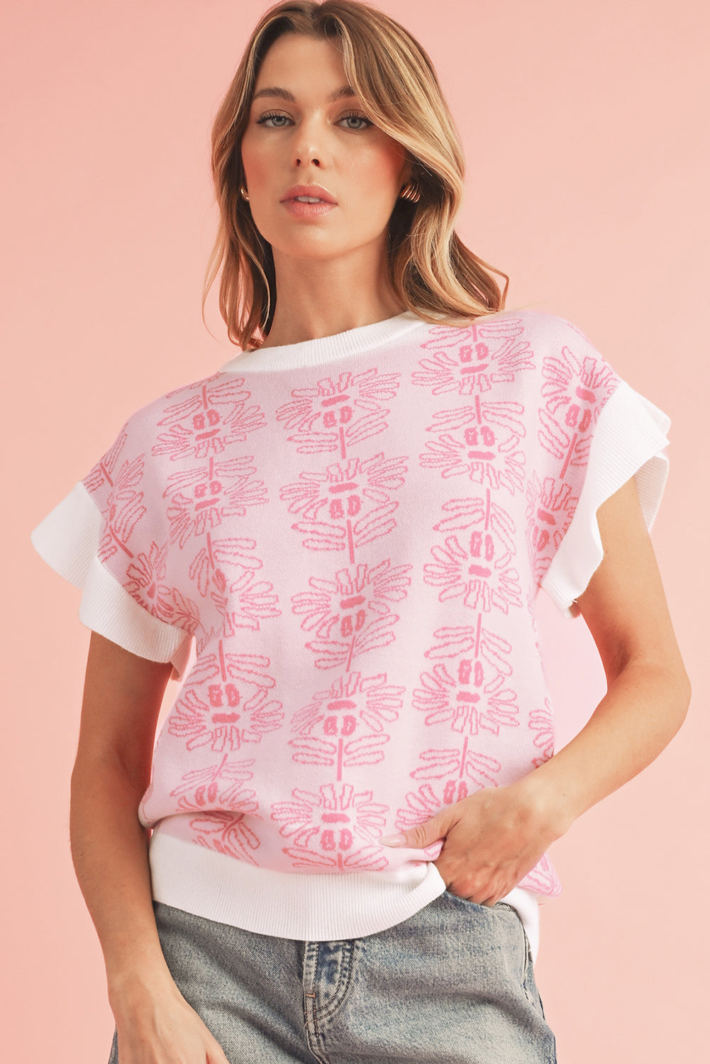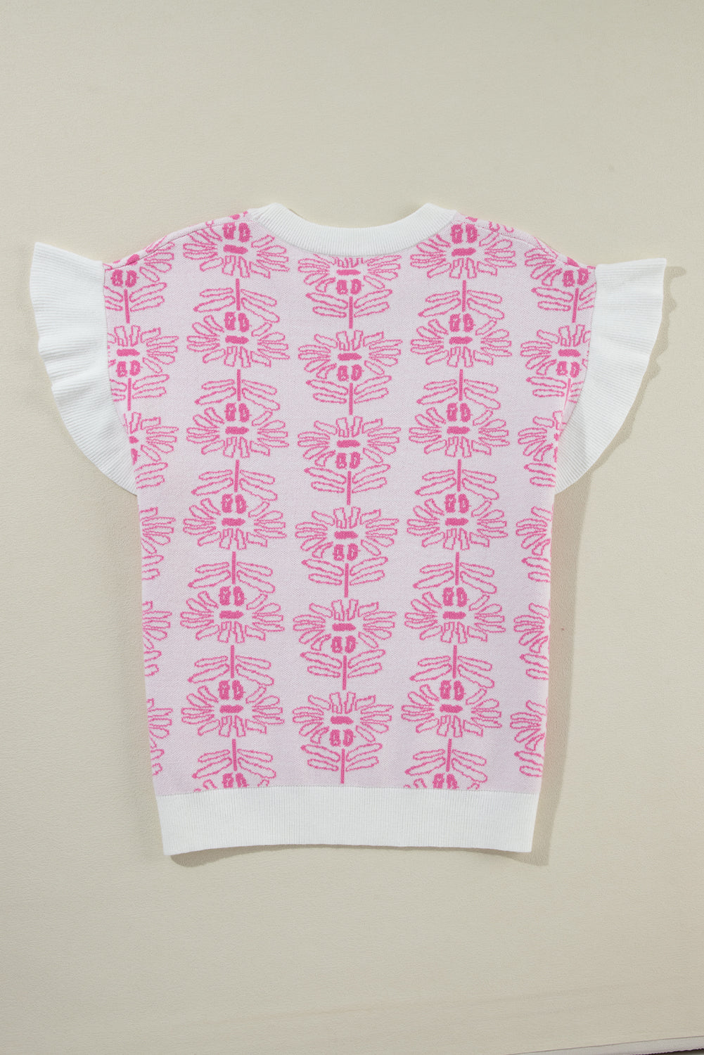 • Embrace effortless elegance with this knit top, blending floral charm with ruffle details for a touch of femininity.