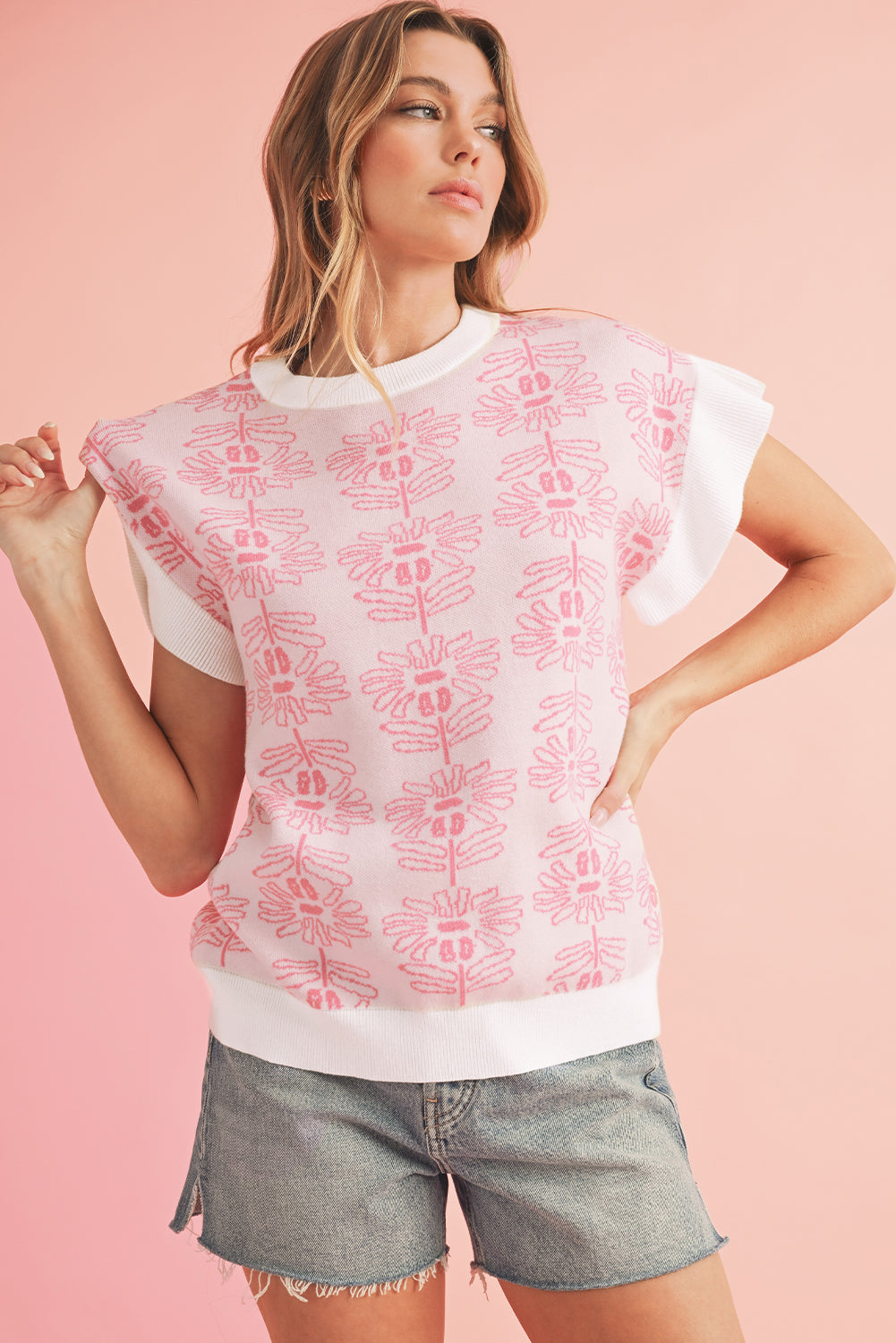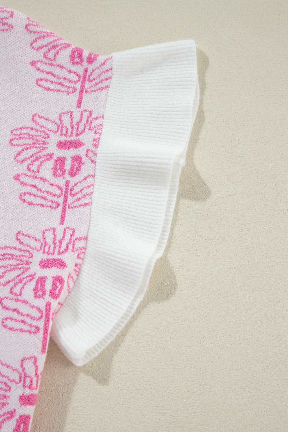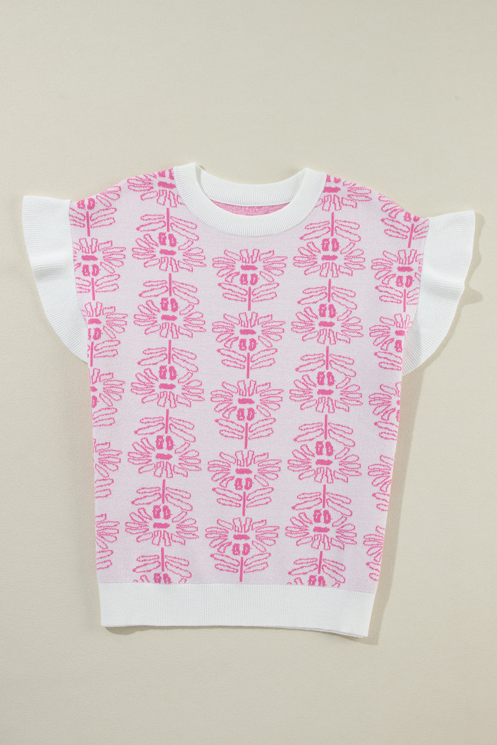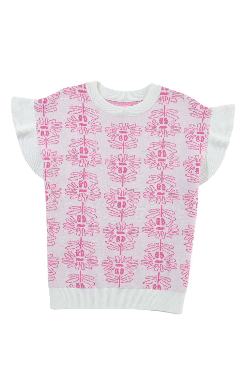 • Embrace effortless elegance with this knit top, blending floral charm with ruffle details for a touch of femininity.