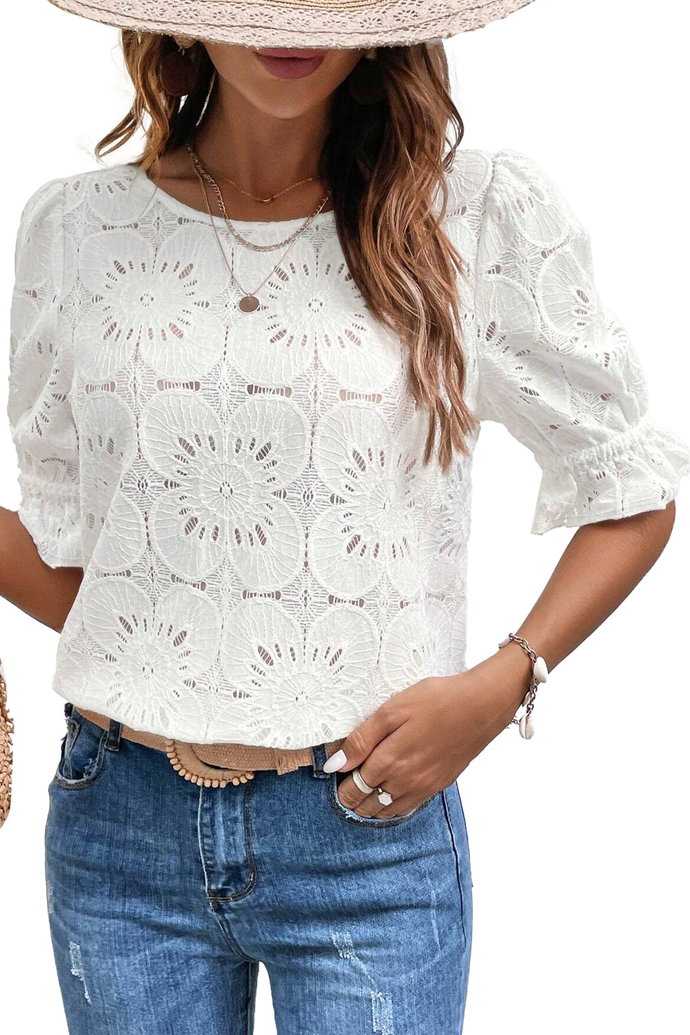 White Flower Eyelet Jacquard Keyhole Puff Sleeve Blouse