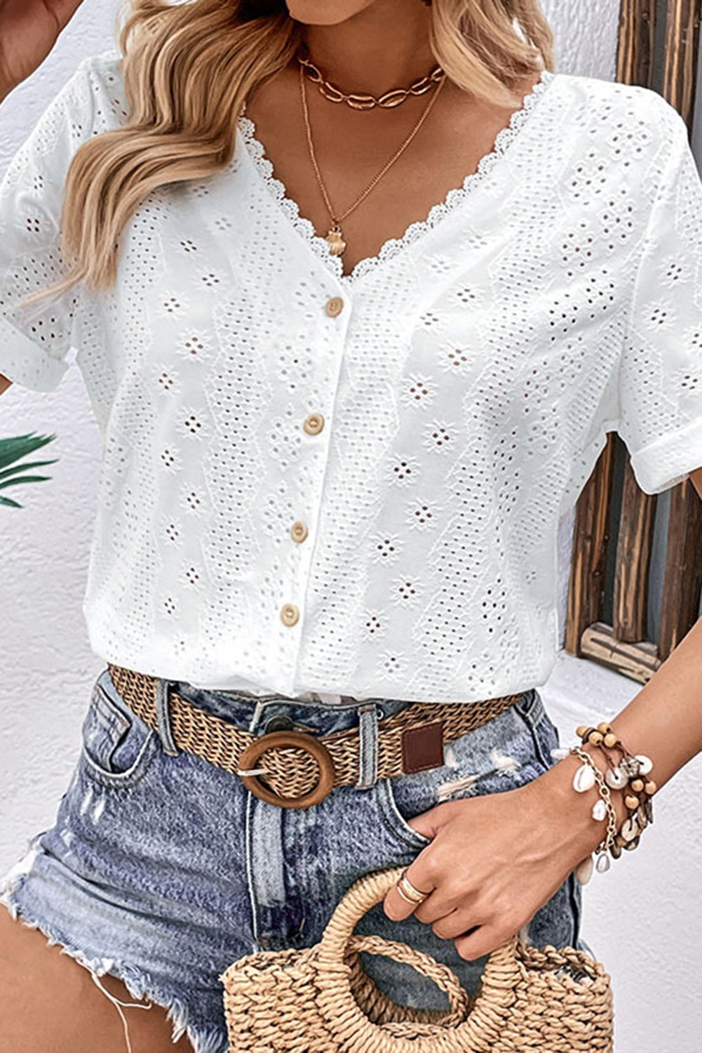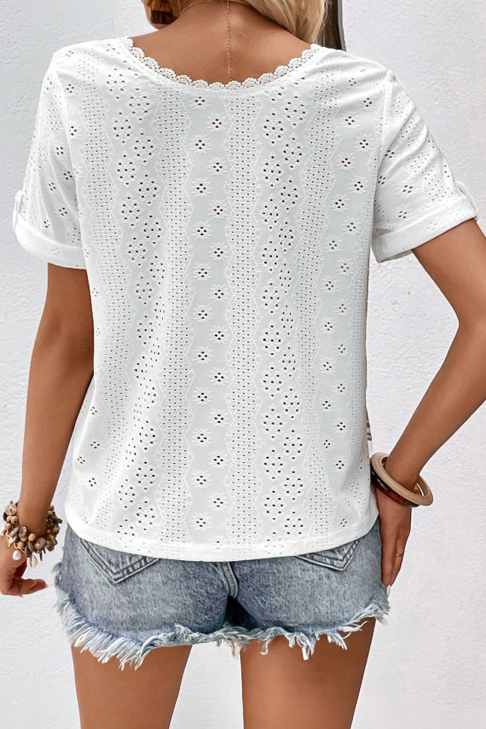 White Reversible V Neck Tab Sleeve Lace Embroidered Blouse