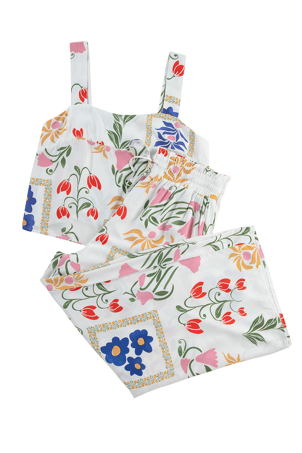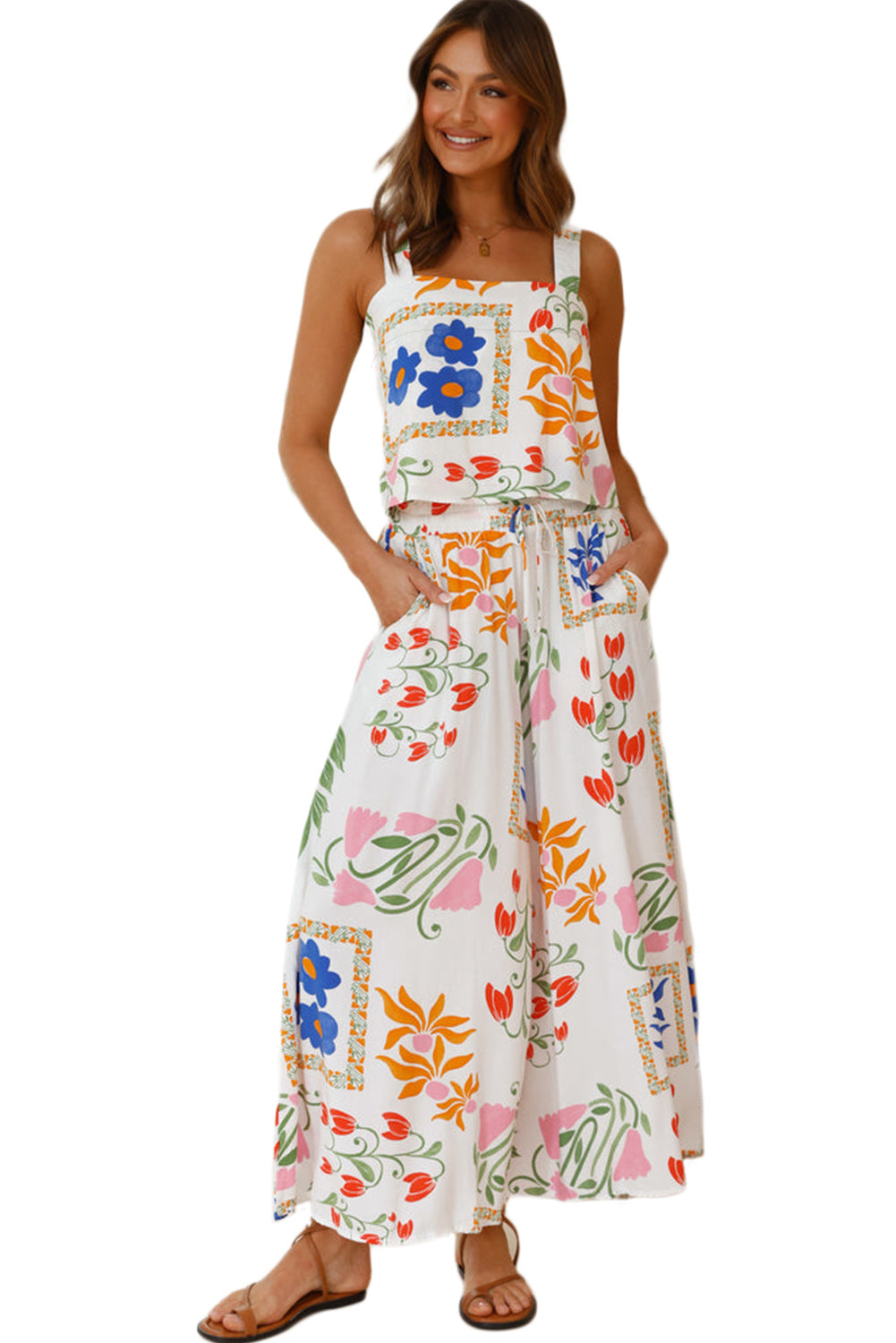 White Square Neck Tank & Wide Leg Pants Boho Floral Set