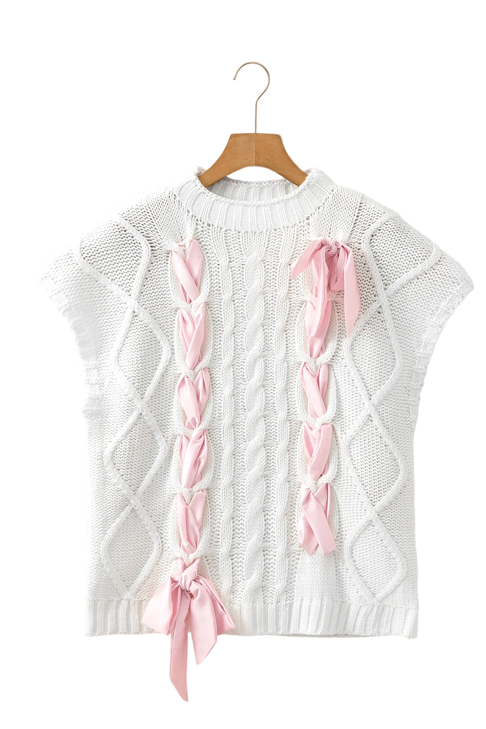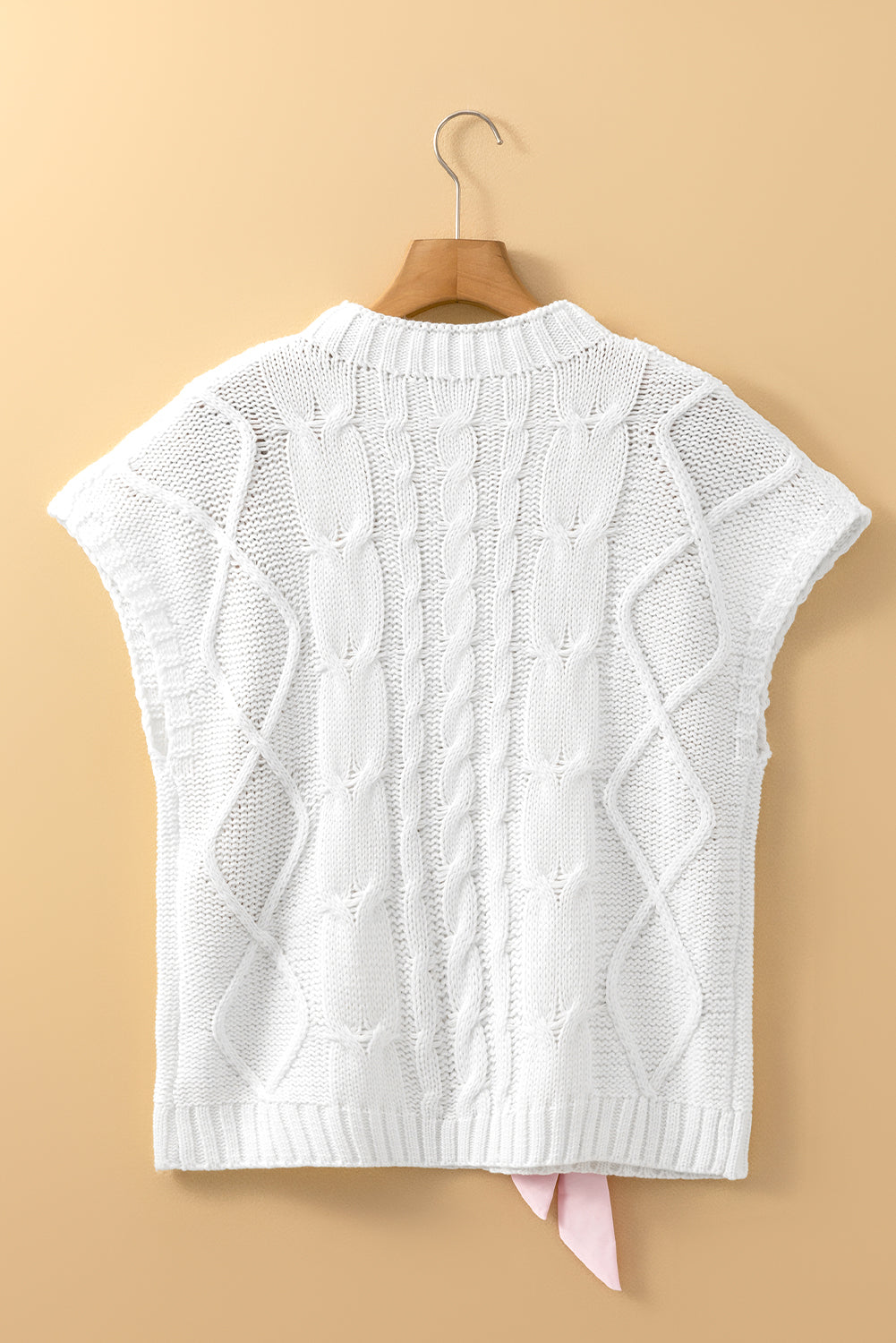 - Chic and feminine, this white satin bow cable knit top brings elegance to any casual look.